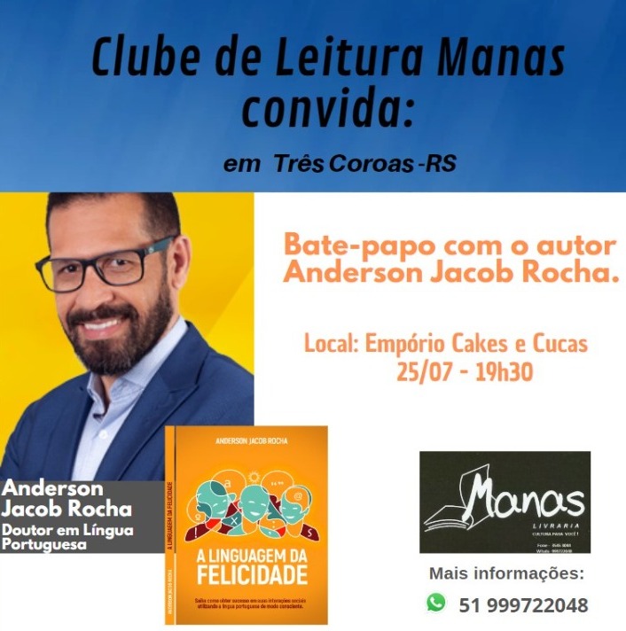 O professor doutor em Língua Portuguesa Anderson Jacob Rocha é o convidado do Clube de Leitura da Manas Livraria. Seu livro “A Linguagem da Felicidade” foi lido pelos membros do clube e, na próxima segunda-feira, 25 de julho, a partir das 19h30, ele estará no Empório Cucas e Cakes, em Três Coroas, onde participará de um bate-papo com música. O evento é gratuito e aberto ao público com interesse no assunto.