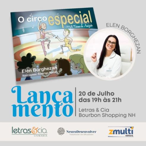 Neste dia 20 de julho, Dia do Amigo, a neuropsicopedagoga Elen Borghezan fará o lançamento do livro “O circo especial”, volume 3 da Série A Turma da Amizade. Na história, logo que o circo se instala no bairro, Max, Luiz, Luiza, Pedro e Daniela se organizam para assistir ao espetáculo. O que eles descobrem no picadeiro que os deixa curiosas e faceiros? Com ilustrações de Rodrigo Nunes, o livro tem um quiz em libras e um desenho para colorir.