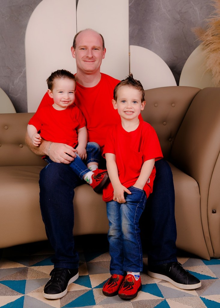 Papai Fabiel Blauth com os filhos Arthur e Felipe. Foto: Analu Arnold e Ivan Oscar