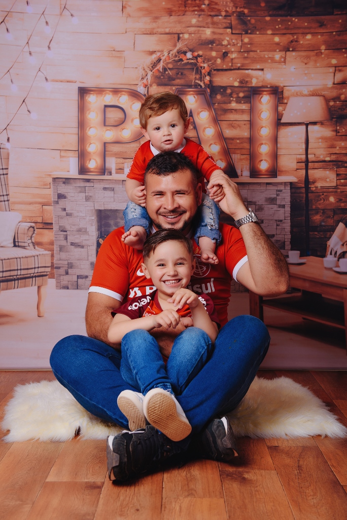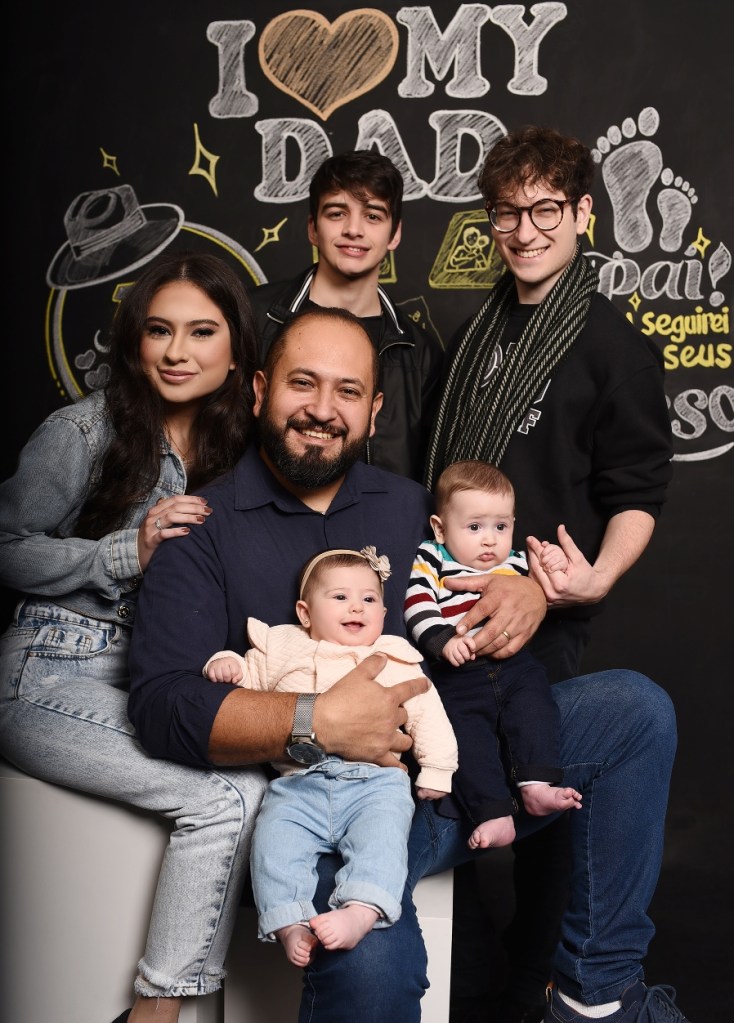 Amor que une pai e filhos… papai Diego Gabriel Lazzaretti com João Gabriel, Pedro Lucas e Antônia. Foto de Vivi Mello