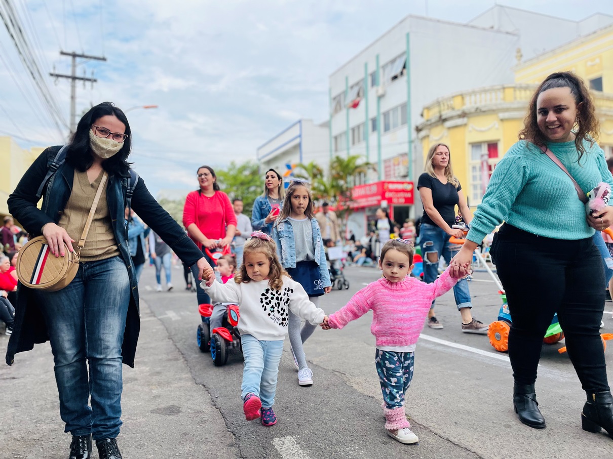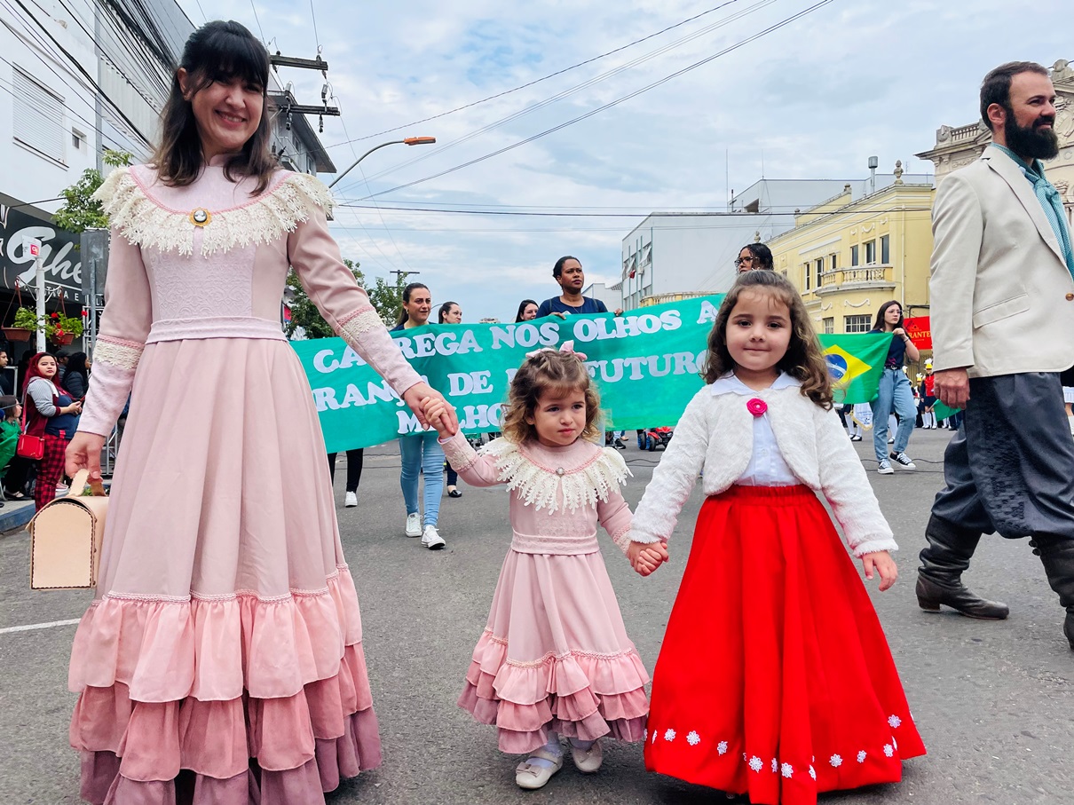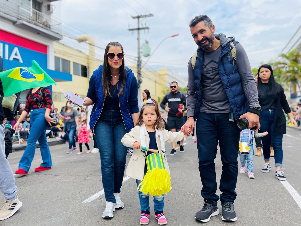 Os passos miúdos das pequenas Estela Ferreira e Isadora Teixeira dos Santos, ambas de 4 anos, percorreram com firmeza os 500 metros da Rua Júlio de Castilhos, no Centro de Taquara, na manhã desta quarta-feira (7) durante o Desfile Cívico. Foi a primeira participação delas no evento, que não ocorria desde 2019. Segundo a organização, mais de 10 mil pessoas entre participantes e plateia estiveram presentes.