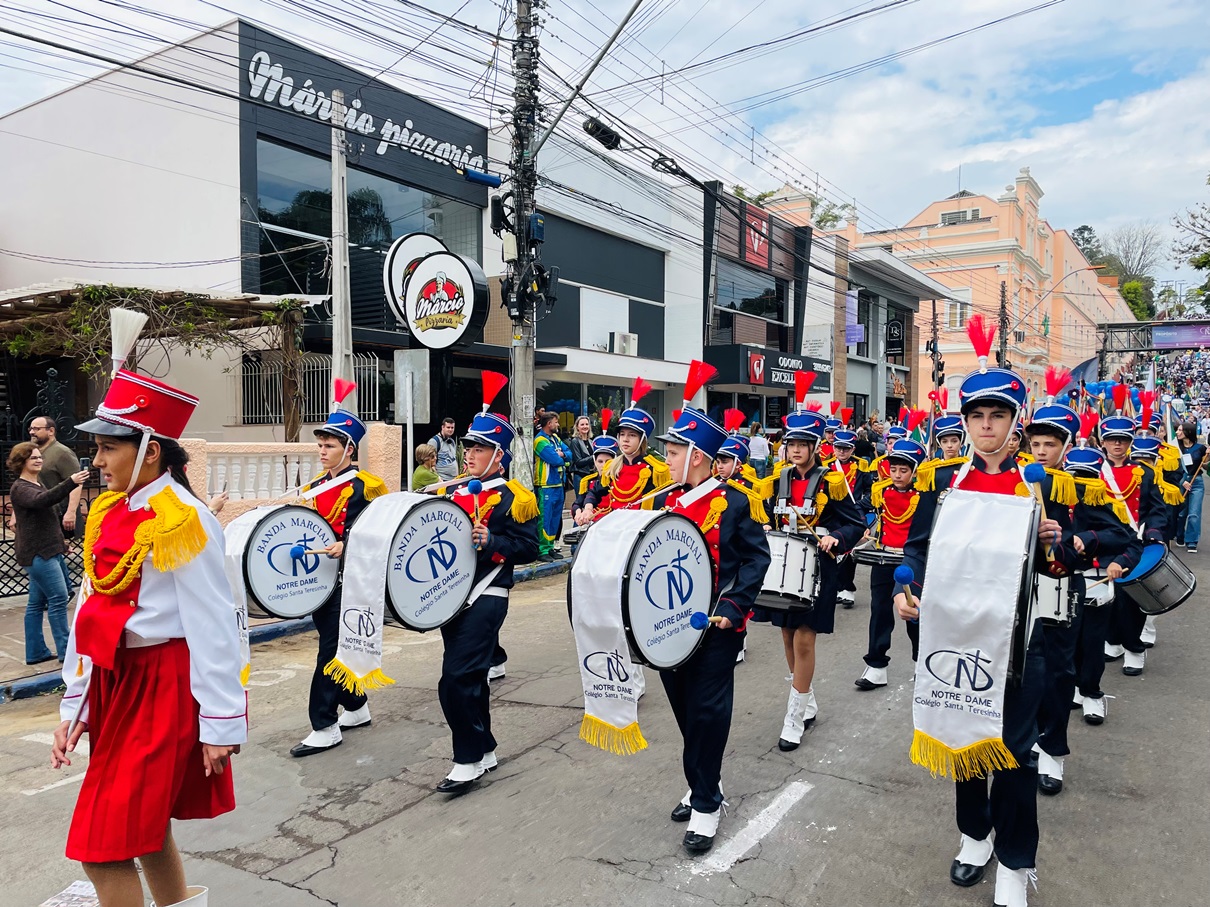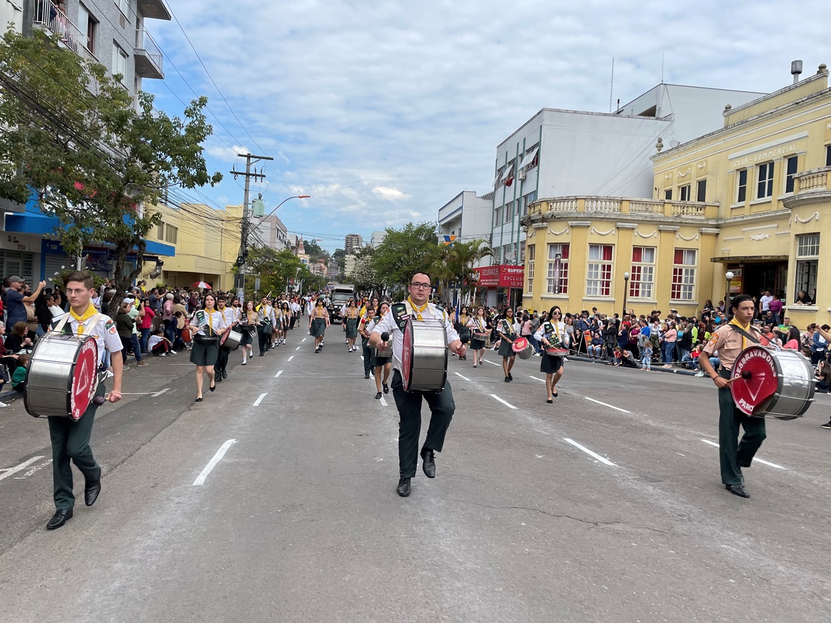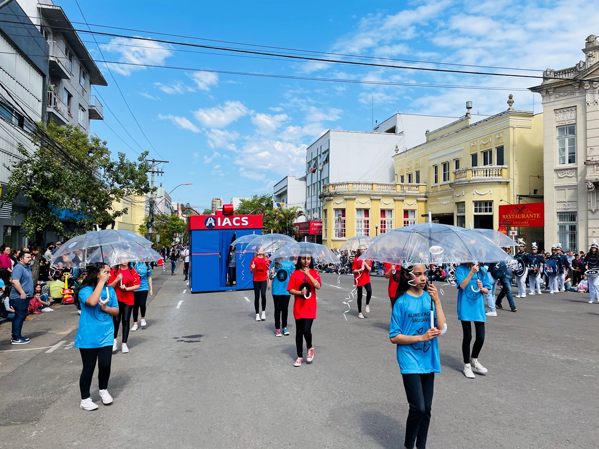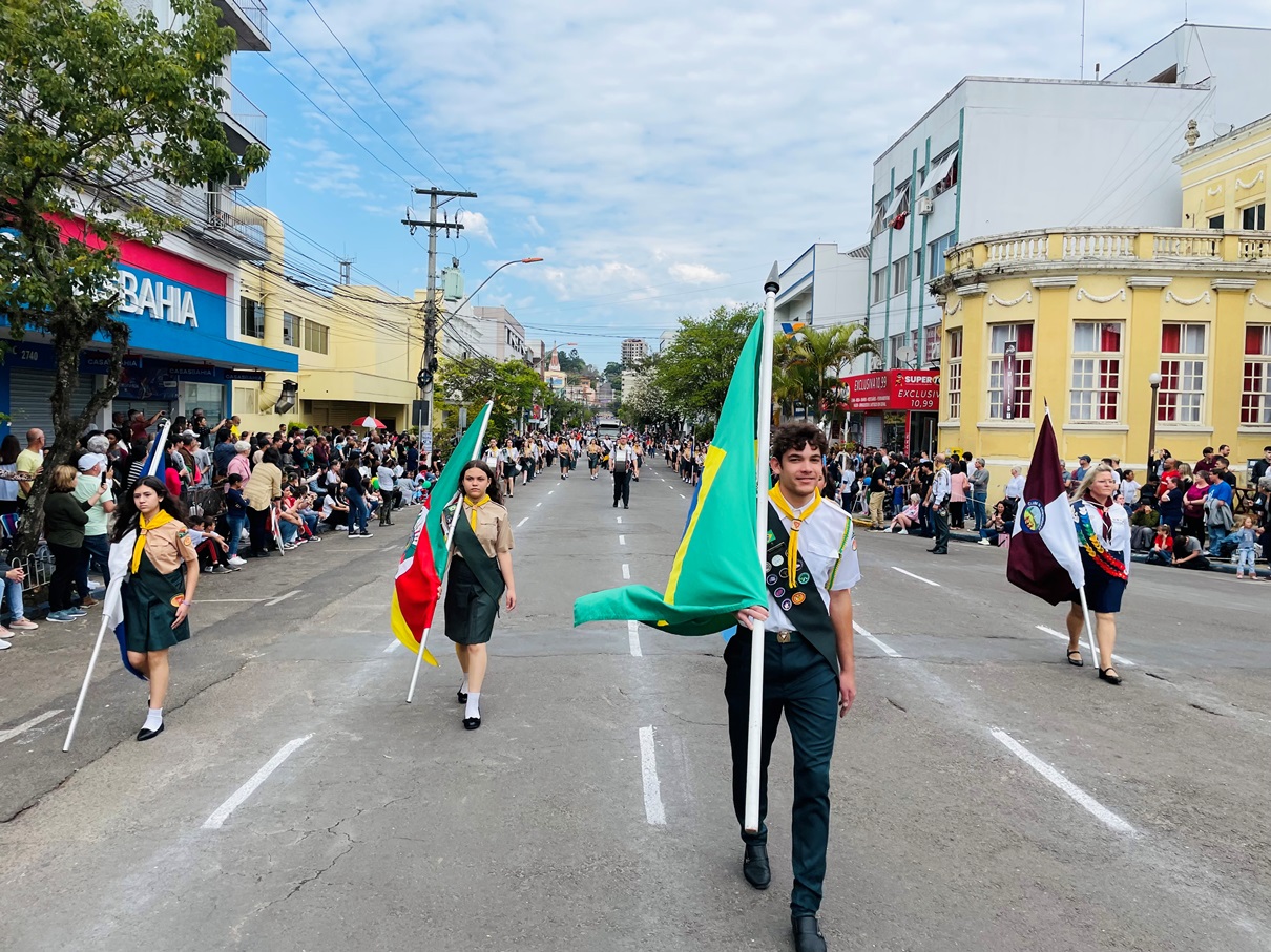 Quatro gerações da família Blauth acompanharam da calçada da Júlio o desfile. “Achei bem organizado, deu para matar a saudade”, comentou Taiane, 25 anos, com o filho Lorenzo, 4, no colo, ao lado da mãe Zenaide, 56, e da avó Zilá, 82, moradoras do Bairro Santa Rosa. Oito bandas marciais abrilhantaram o desfile e arrancaram aplausos da plateia que se espalhou entre a Câmara de Vereadores e a Praça Marechal Deodoro.