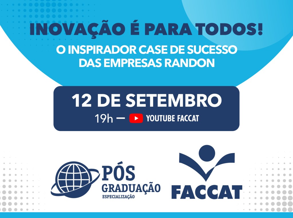 Com o tema “Inovação é para todos!”, será realizada na próxima segunda-feira (12), das 19 às 21 horas, uma live através do canal do youtube das Faculdades Integradas de Taquara (Faccat). A principal finalidade deste bate-papo é debater a relevância do tema inovação quanto ao desenvolvimento de novos produtos, processos, serviços, novos meios de competir e cooperar no ambiente empresarial. De acordo com um dos organizadores do encontro, o professor Gerson Schneider, a ideia é frisar a importância e o poder da inovação para o crescimento nos negócios. “Vamos discutir a perspectiva dos impactos que a inovação irá trazer para todas as empresas. Será analisado o case inspirador das empresas Randon”, revela Schneider. O evento é gratuito e as inscrições devem ser feitas em www.faccat.br/cursoseeventos. A promoção é da Vice-Direção de Pós-Graduação e Pesquisa da Faccat.