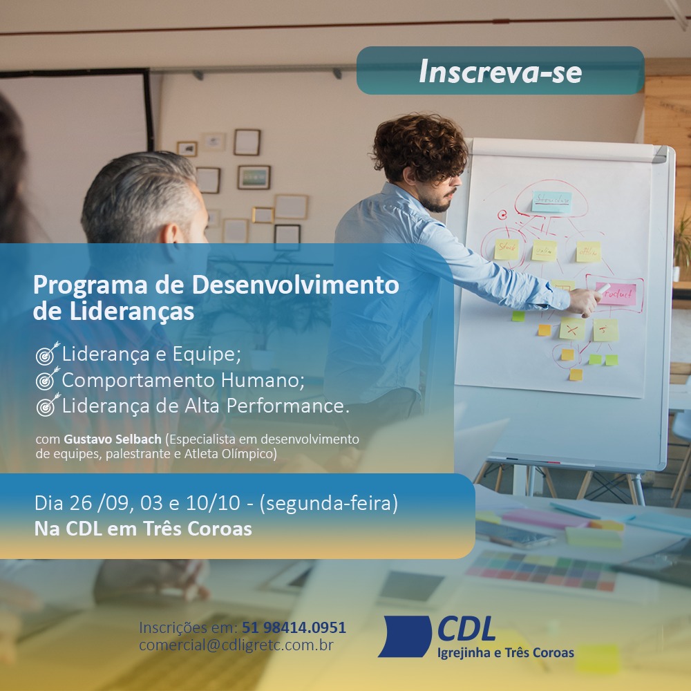 Ser líder de si mesmo, liderar projetos e liderar equipes é essencial no mercado de trabalho. Por entender a importância deste tema, a Câmara de Dirigentes Lojistas de Igrejinha e Três Coroas traz esta temática em forma de um curso para os associados e comunidade em geral. Estão abertas as inscrições para o Programa de Desenvolvimento de Liderança – PDL com Gustavo Selbach. Ele é especialista em desenvolvimento de equipes, palestrante e ex-atleta olímpico. As aulas acontecerão nas segundas-feiras (dias 26 de setembro, 03 e 10 de outubro) das 19h às 22h30, na sede da CDL em Três Coroas!