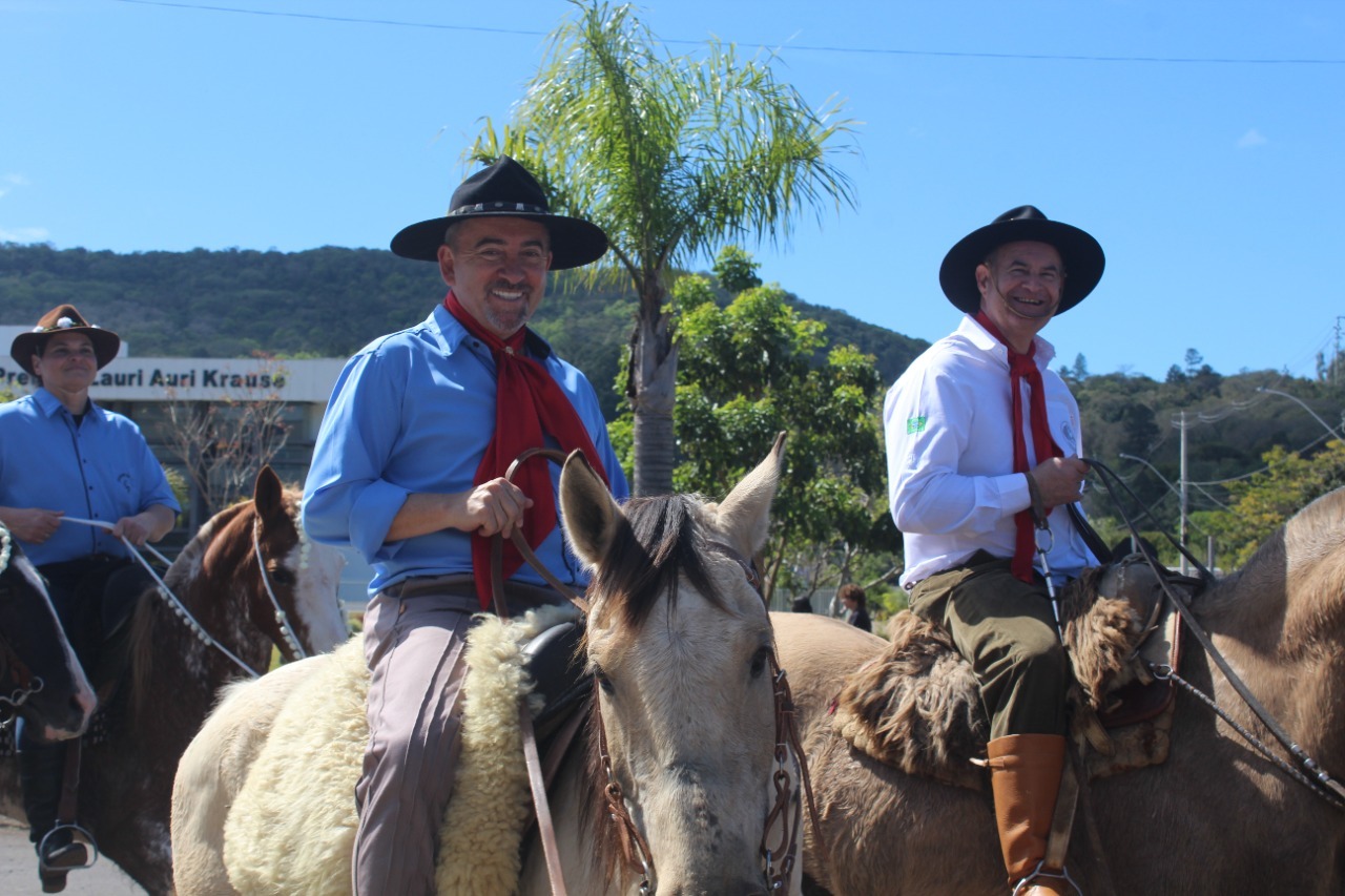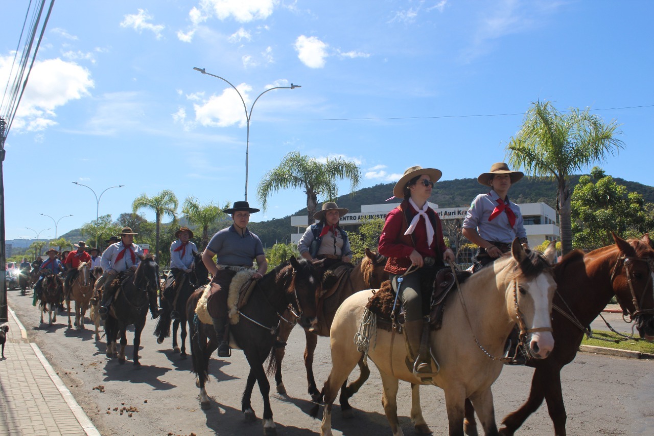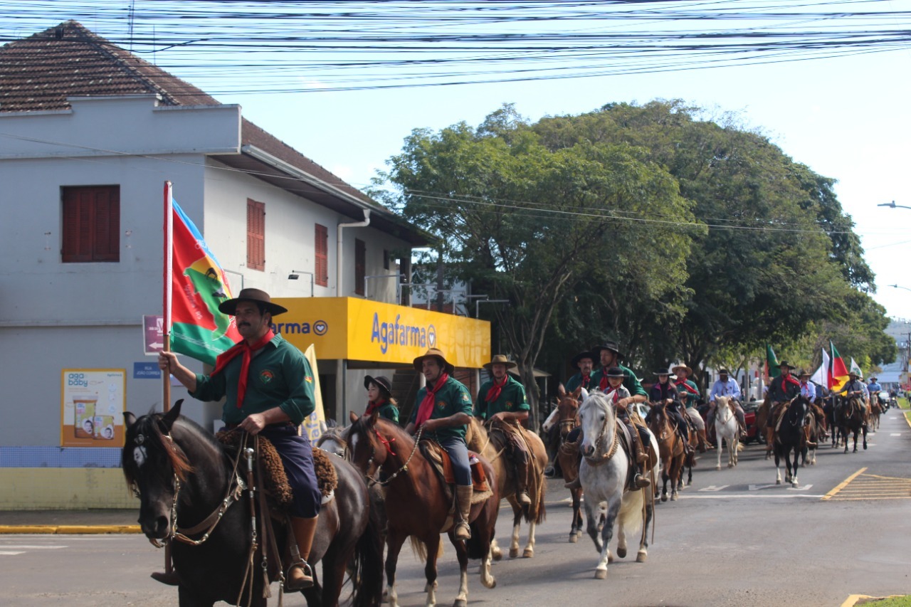 Na manhã o último sábado (17), as ruas de Igrejinha foram palco do Desfile Farroupilha 2022. Com cavaleiros pilchados, o desfile iniciou no Parque de Eventos Almiro Grings e seguiu até o CTG Rancho do Chimarrão, onde finalizou seu percurso com um almoço festivo. Participaram cerca de 100 cavaleiros, representando as entidades tradicionalistas do município.