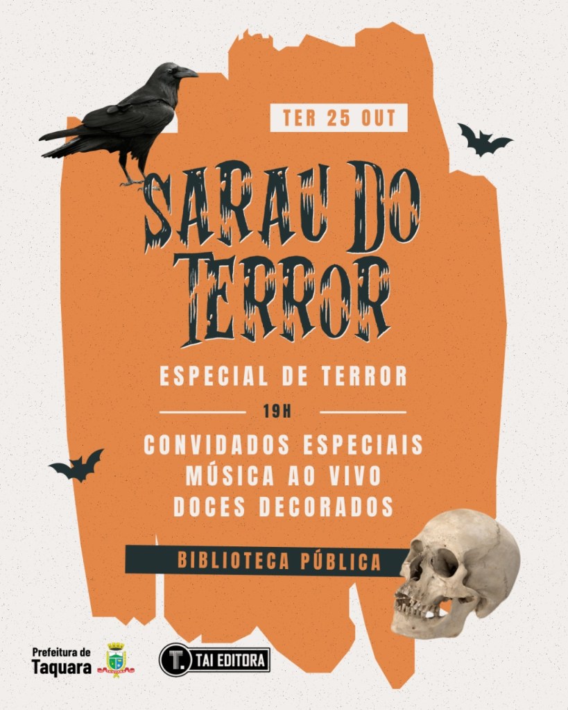 Aproveitando a semana do Halloween, na próxima terça-feira (25), às 19h, a Biblioteca Pública Municipal Professor Rodolfo Dietschi, de Taquara, vai receber o 1º Sarau do Terror. O evento contará com leitura de contos de terror, bate-papo com escritores, música ao vivo e comércio de doces temáticos. A festa que é voltada para o público jovem adulto é realizada pela Diretoria de Cultura, através da Biblioteca Pública e pela Tai Editora. Informações podem ser obtidas pelo telefone (51) 3541-9200 – ramal 293.