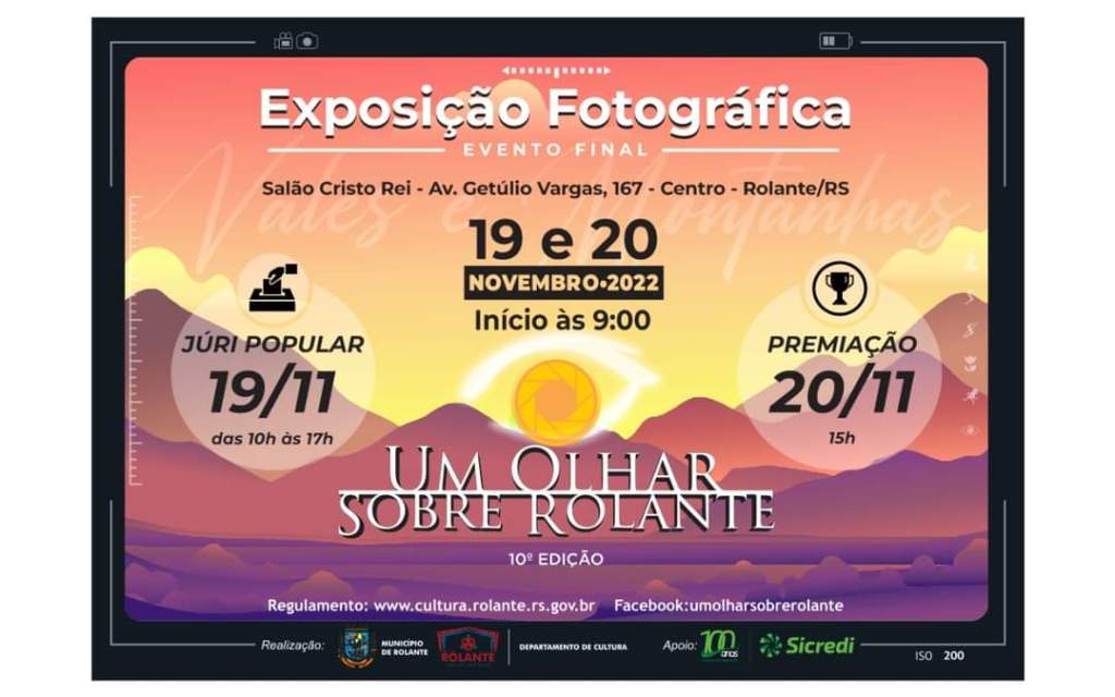 A exposição do 10º Concurso Fotográfico Um Olhar Sobre Rolante será realizada neste fim de semana, nos dias 19 e 20 de novembro (sábado e domingo), no Salão Cristo Rei, a partir das 9h. Com o tema “Vales e Montanhas” as fotografias buscam valorizar os contrastes do relevo, evidenciando e reconhecendo as belas paisagens do município.