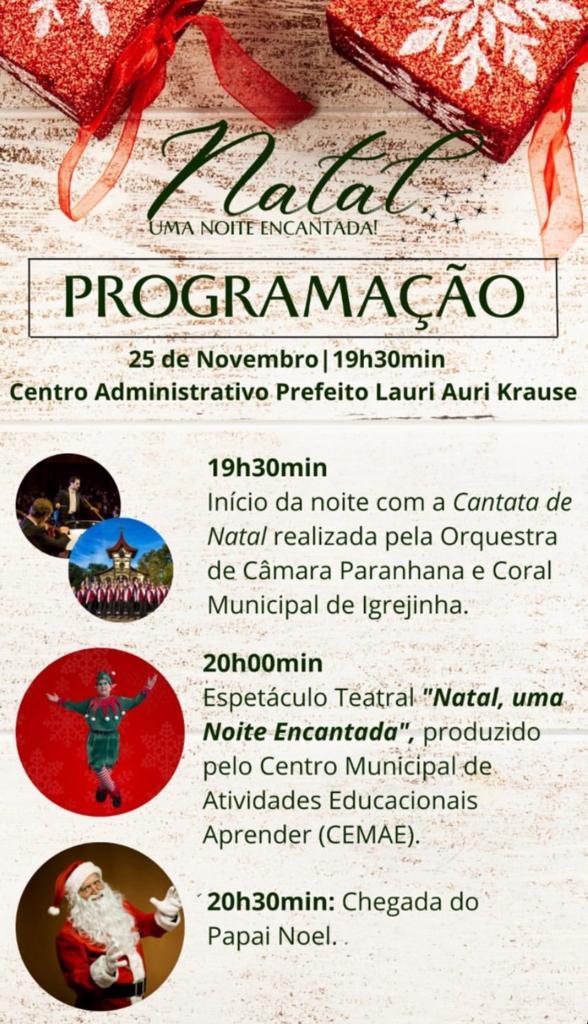 Às 19h30, a programação inicia com a Cantata de Natal, que será realizada pela Orquestra de Câmara do Paranhana e Coral Municipal de Igrejinha. Na sequencia, o espetáculo teatral “Natal, Uma noite Encantada” realizado pelos alunos do Centro Municipal de Atividades Educacionais Aprender (CEMAE) promete encantar o público. Para fechar a noite, acontecerá a chegada do Papai Noel descendo de rapel da cobertura do Centro Administrativo.