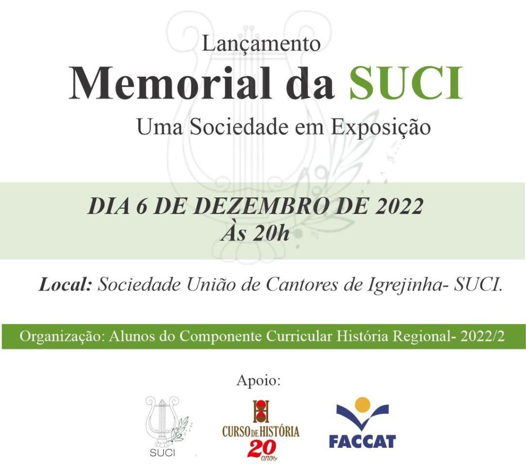 De acordo com a coordenadora do curso de História da Faccat, Andrea Petry Rahmeier, este é um projeto em conjunto com a Suci e conta com a participação dos acadêmicos da disciplina “História Regional, Educação Patrimonial e Memória”, do semestre de 2022/02. “Será um grande evento. Muita pesquisa e estudo foram feitos. A história da Suci será contada através deste trabalho”, revela Andrea.