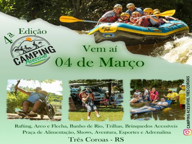Aproximar as pessoas com deficiências, integrando-as com atividade em meio a natureza. Esta é a proposta do Camping Acessível, que será realizado no dia 04 de março (sábado), no Raft Adventure Park. Esta é a quarta edição do evento e terá atividades de tiro de arco e flecha, banho de rio com cadeira anfíbia, trilhas no park (para o lago), banho no lago e step up paddle, playground adaptado e inclusivo, bocha adaptada, pPara-badminton e vivências com bote de rafting. Tudo isso em meio às belezas naturais de Três Coroas.