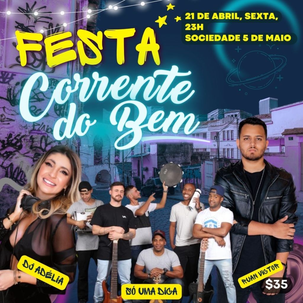A noite desta sexta-feira (21) será de solidariedade e diversão. Um grupo de voluntários promove a festa Corrente do Bem que tem como objetivo de arrecadar dinheiro para ajudar no custeio de tratamentos de crianças que sofrem com doenças crônicas e complexas. O evento será realizado na Sociedade 5 de Maio, com início às 23 horas e terá shows com Dj Adélia, Ruan Victor e Só Uma Dica. Os ingressos estão sendo comercializados pelos integrantes do grupo por R$25,00 antecipados e, na hora, o valor será R$ 35,00. Ingressos e mais informações podem ser adquiridas através do telefone/WhatsApp 51 99349.9193 ou pelo Instagram @correntedobem_elo.