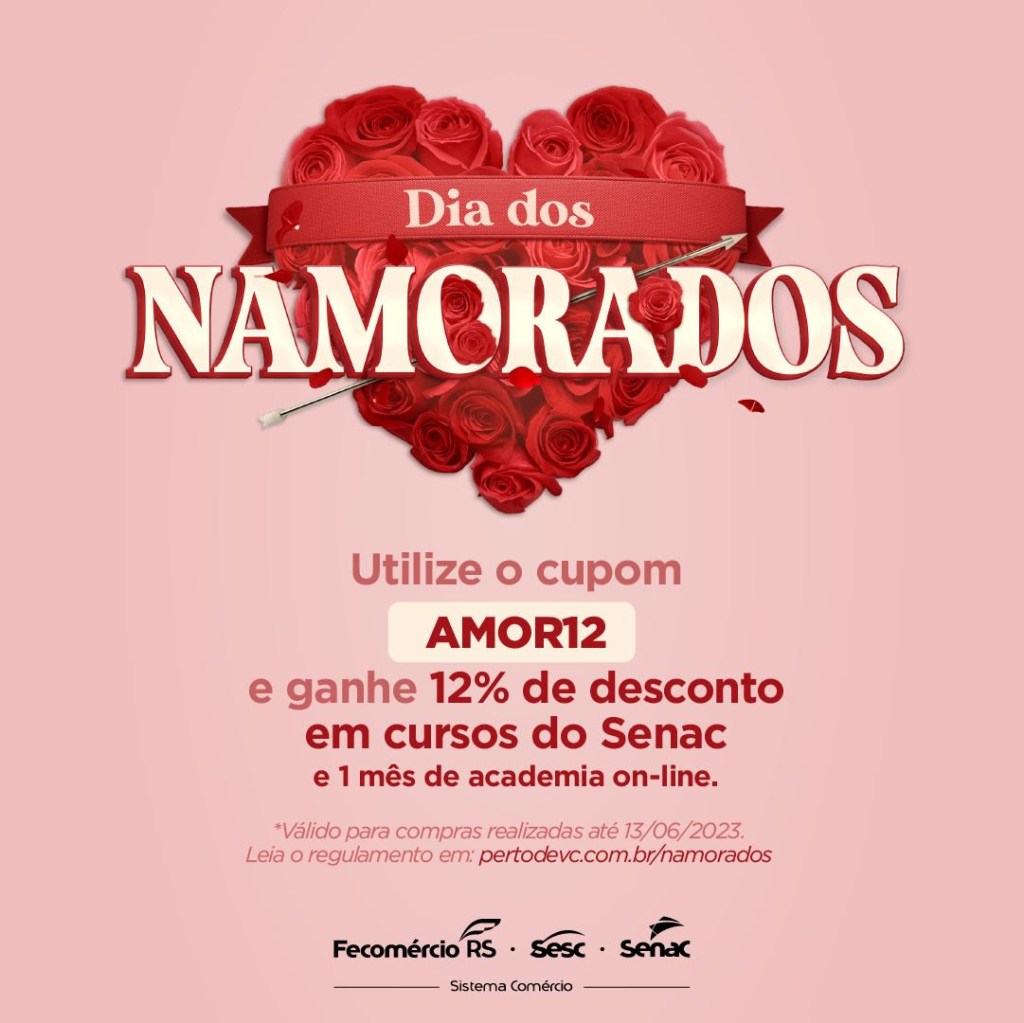 Para comemorar o Dia dos Namorados, entre os dias 5 e 13 de junho, o Sistema Fecomércio-RS/Sesc/Senac disponibiliza o cupom “AMOR12”, que garante desconto de 12% em diversos serviços de educação, bem-estar e turismo. Para conhecer a listagem completa ofertada, basta acessar o site ou ir até o Sesc ou Senac mais próximo. No Vale do Paranhana, as unidades ficam no município de Taquara. O Sesc está localizado na Rua Júlio de Castilhos, 2843, Centro. Já o Senac fica na Rua General Frota, 2661, também no Centro.