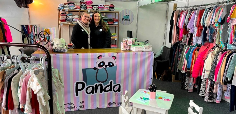 Somos a única loja de roupa infantil da feira e pra nós está sendo uma ótima vitrine. Nossa loja não é centralizada e muita gente de Igrejinha não conhece. Também atendemos aqui muitas pessoas de outros municípios da região que acredito que possam vir a se tornar nossos clientes também. Está sendo uma boa oportunidade de vendas e de contato.” Ana Carina Kunst Fernandes – Panda Kids (foto de capa)