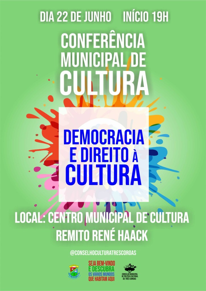 Três Coroas realiza no próximo dia 22 (quinta-feira), a sua Conferência Municipal de Cultura. O encontro será no Centro Municipal de Cultura Remitto René Haack, com início às 19 horas. O momento é destinado a artistas, produtores culturais e fazedores de cultura do município e gratuito aos interessados.