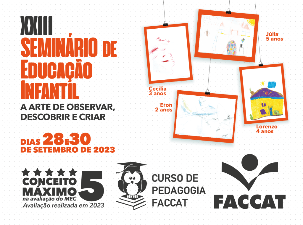 Com o tema “Educação Infantil: A arte de observar, descobrir e criar”, o XXIII Seminário de Educação Infantil, que ocorrerá nos dias 28 e 30 de setembro, nas Faculdades Integradas de Taquara (Faccat). As inscrições seguem até o dia 26 de setembro. O evento tem a finalidade de proporcionar momentos de aprendizagem e de trocas de conhecimento entre os participantes. A realização é do curso de Pedagogia.