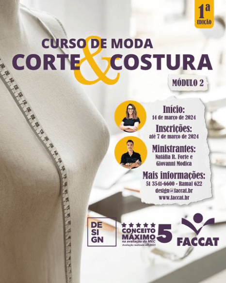 O curso de Design das Faculdades Integradas de Taquara (Faccat) está com inscrições abertas para o Módulo 2 do curso de extensão Corte & Costura. As aulas ocorrerão de 14 de março a 25 de julho, no Atelier de Design de Moda, no campus da Instituição. A capacitação é indicada para aqueles alunos egressos do Módulo 1, do Corte e Costura da Faccat, e alunos das demais instituições com certificado na área, com idade mínima de 16 anos. O curso de Corte e Costura – Módulo 2 acontecerá todas as quintas-feiras, à noite, das 19h15min às 22h15min.