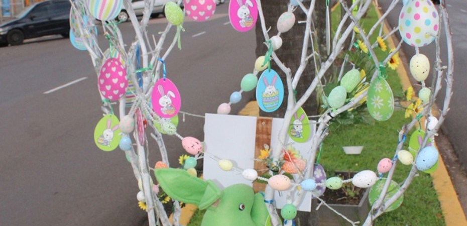 Trata-se da decoração da árvore de Páscoa, através de um galho seco com ovos coloridos, que representam vida nova. Uma tradição trazida dos antepassados alemães que colonizaram a região. Esses galhos darão vida aos vasos distribuídos ao longo da Avenida Santa Maria.