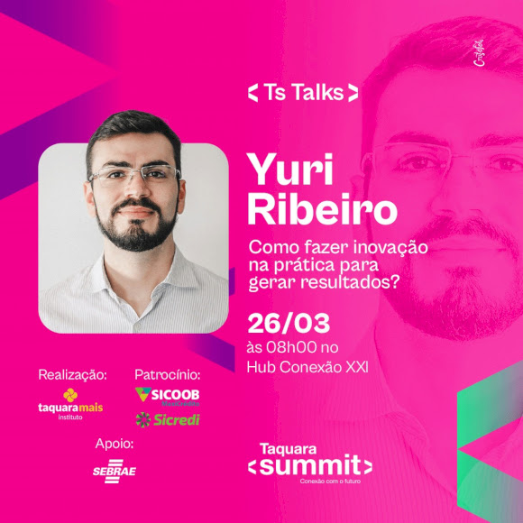 Abrindo o seu calendário de eventos em 2024, o Instituto Taquara Mais promove, na próxima segunda-feira (26), às 8 horas, o Ts Talks “Como fazer inovação na prática para gerar resultados?“. O convidado é Yuri Ribeiro, administrador, com MBA em Gestão e Relações Internacionais e Mestre em Administração, com ampla experiência em gestão de projetos de inovação tanto em governos quanto em empresas.