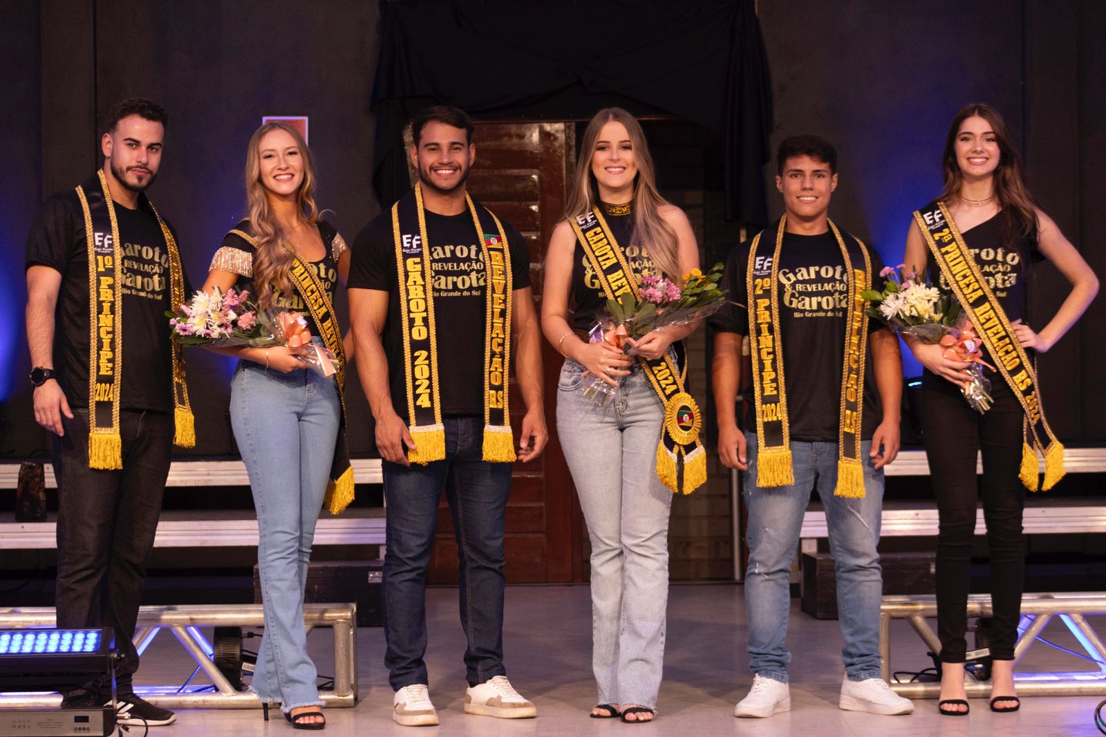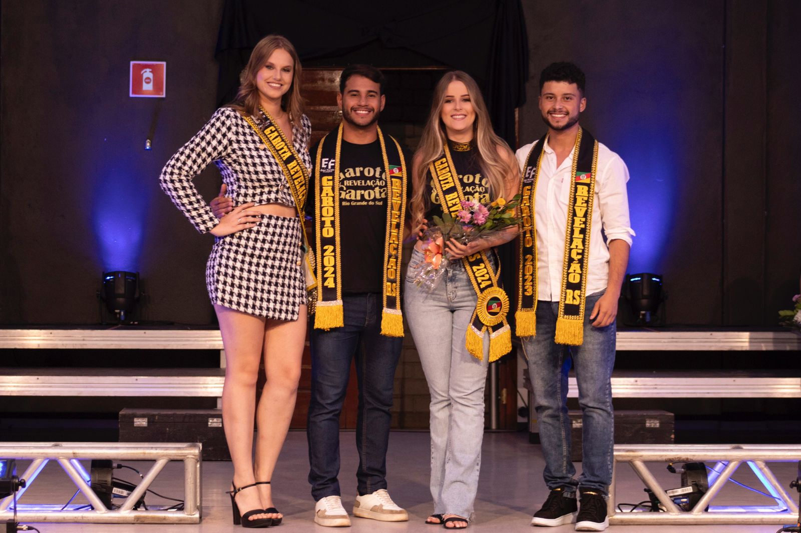 Os vencedores do concurso estadual Garoto e Garota Revelação 2024 já são conhecidos. Foi escolhida como Garota Revelação RS Bruna Eloísa Grigio, 23 anos, de Canoas, e como Garoto Revelação RS, William Guilherme Soares, 23 anos, de Porto Alegre. A corte ainda tem a 1ª Princesa Jennifer Lopes, 16 anos, de Capão da Canoa, o 1º Príncipe Matheus Simon, 25 anos, de Gramado, a 2ª Princesa Taíssa Miranda Silva, 16 anos, de Parobé e o 2º Príncipe, Antônio Cardozo, 15 anos, de Tapes. Os eleitos tem a missão de representar o concurso em eventos, júris e ações, sucedendo a Joana Yasmin Diedrich e Tassiel Lima Forte, Garota e Garoto Revelação 2023.