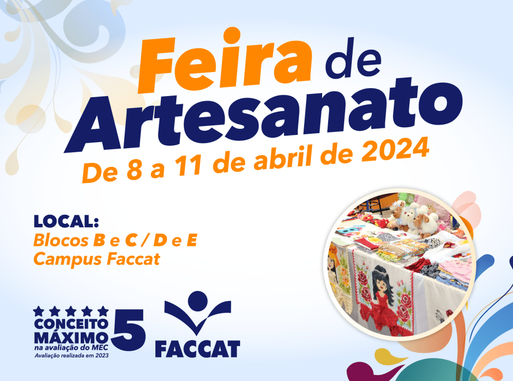 A comunidade está convidada a participar da próxima Feira de Artesanato, que será realizada de 8 a 11 de abril de 2024, das 19h às 22h, nos Blocos B e C / D e E no campus das Faculdades Integradas de Taquara (Faccat).