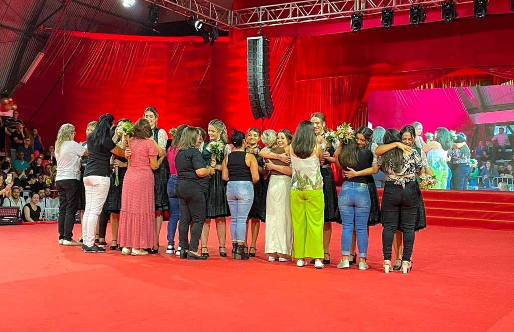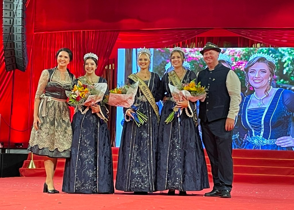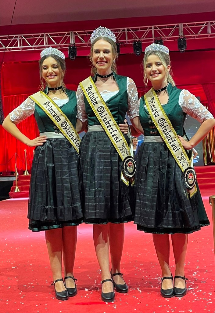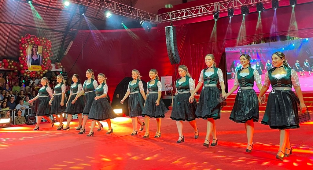 A Roberta Klein, 28 anos, relembra as demais candidatas e a qualidade do grupo. “É uma felicidade sem fim poder estar aqui representando, ter sido escolhida entre tantas meninas que são maravilhosas. A gente sempre falava que o nosso time foi um time incrível que se fortaleceu muito. Falávamos que elevamos tanto o nível que era necessário se esforçar muito para se destacar e conseguir estar aqui. Vamos representar com orgulho todas elas e a toda essa festa maravilhosa”, declara. A princesa Tainá dos Santos, 22 anos, reforça essa ideia e evidencia o comprometimento. “Estou muito feliz, muito grata. Escutar o nosso nome ser chamado lá em cima gera um sentimento de gratidão enorme porque nós fomos escolhidas no meio de 11 meninas que estavam muito bem preparadas. Agora a gente tem a incrível missão de representar a nossa festa e o sonho dessas outras meninas que estavam conosco e principalmente os nossos voluntários”. Daniela Coitinho Hachenher, 20 anos, a mais jovem das candidatas que se elegeu princesa da festa, evidencia a importância do título. “Pra mim é uma honra, sendo tão jovem, poder representar a nossa festa que tem um legado cultural muito especial e num ano tão especial que é o do bicentenário da imigração alemã no Brasil”.
