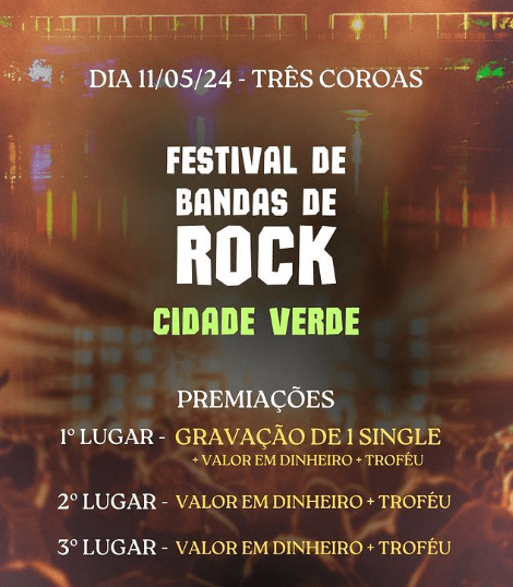 Um dos mais tradicionais festivais de música amadora está de volta. Integrando a programação de aniversário de Três Coroas, no próximo dia 11 de maio (sábado), às 19h15, acontece o 17º Festival Amador de Bandas de Rock Cidade Verde. O evento, que não é realizado desde 2019, antes da pandemia, retorna para o calendário oficial trescoroense e traz ares de nostalgia com desejo de que se mantenha firme.