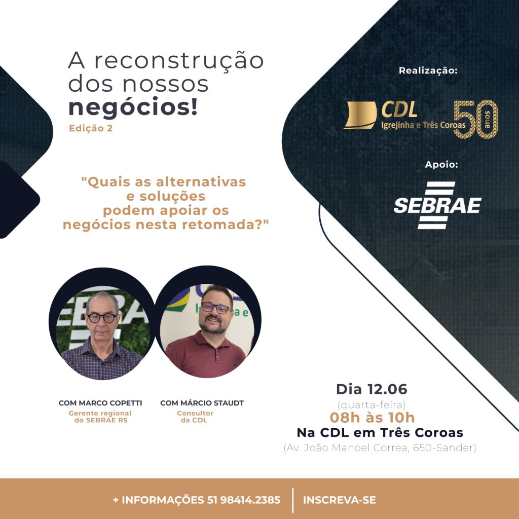 Atenta à situação do pós-enchente no Rio Grande do Sul e, principalmente na região, a Câmara de Dirigentes Lojistas de Igrejinha e Três Coroas segue promovendo articulações e ações para ajudar a economia local nessa retomada. Por isso, na próxima semana, dia 12 (quarta-feira), das 08h às 10h, a entidade realiza a segunda edição do “Encontro: A Reconstrução dos Negócios”. A temática “Quais as alternativas e soluções podem apoiar os negócios nesta retomada?” será abordada com participação do Gerente Regional do Sebrae, Marco Coppetti, e do Consultor da CDL Márcio Staudt.