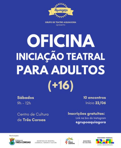 O Grupo de Teatro Aquiagora, de Três Coroas, abriu inscrições para a Oficina de Iniciação Teatral para adultos. As aulas são voltadas para adultos, portanto, podem participar pessoas a partir de 16 anos de idade, sem limite máximo. Serão 10 encontros, que acontecerão aos sábados, das 9h às 12h, no Centro de Cultura de Três Coroas (Rua Luís Volkart, 155 – Centro). A data de início será no dia 22 de junho.