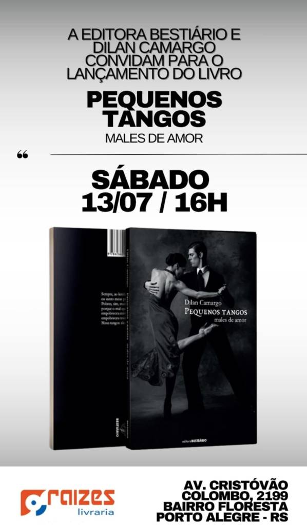 O premiado escritor Dilan Camargo lança, no próximo sábado (13), seu novo livro. “Pequenos Tangos” é uma obra de poesia destinada ao público adulto – diferente da maioria de seus 30 livros que são destinados ao público infanto-juvenil. Conforme o autor, trata-se de um livro de poesias sobre “os males de amor”, tão cantados nas letras de tangos. São poemas que dialogam com o quase trágico sentimentalismo de histórias de amor. “Escrevi os textos com essa atmosfera emocional. Eu já tinha escrito a maioria dos poemas há algum tempo. Resolvi então retomar o projeto, revisar e reescrever, além de escrever novos poemas. Fiz isso durante o verão”, conta. O título “Pequenos Tangos” vem diante da grandeza poética e musical dos tangos clássicos. “É uma referência e uma reverência aos poetas das letras de tangos”, pontua.