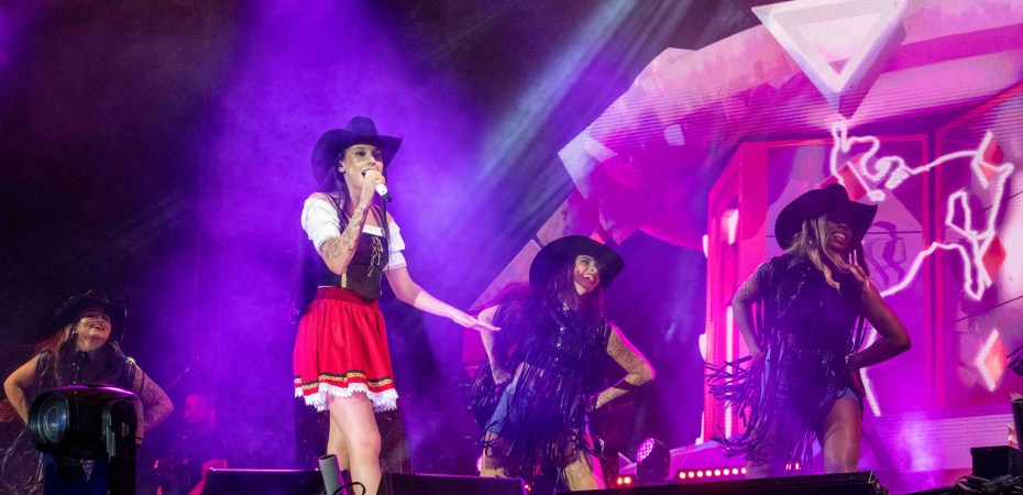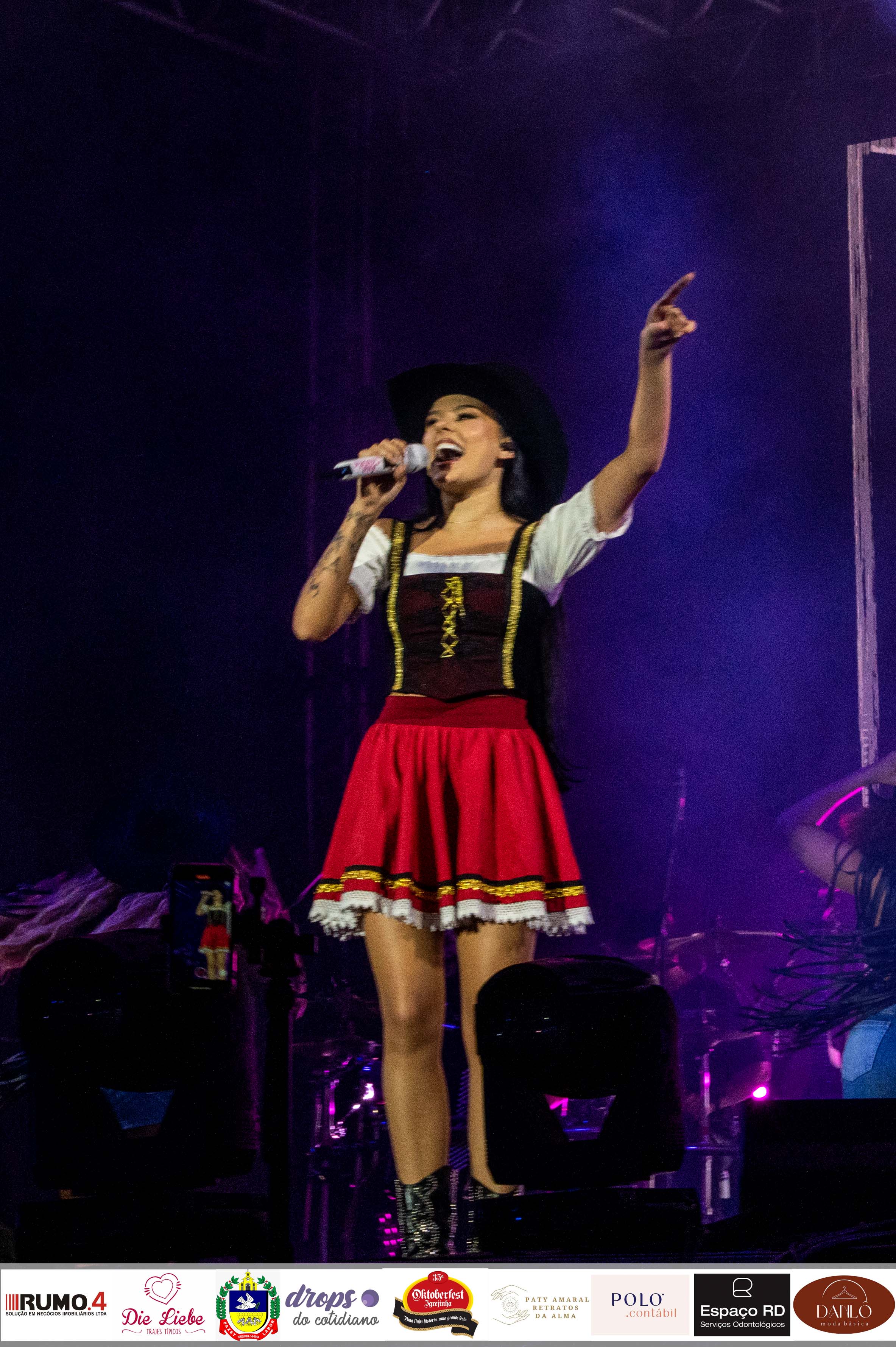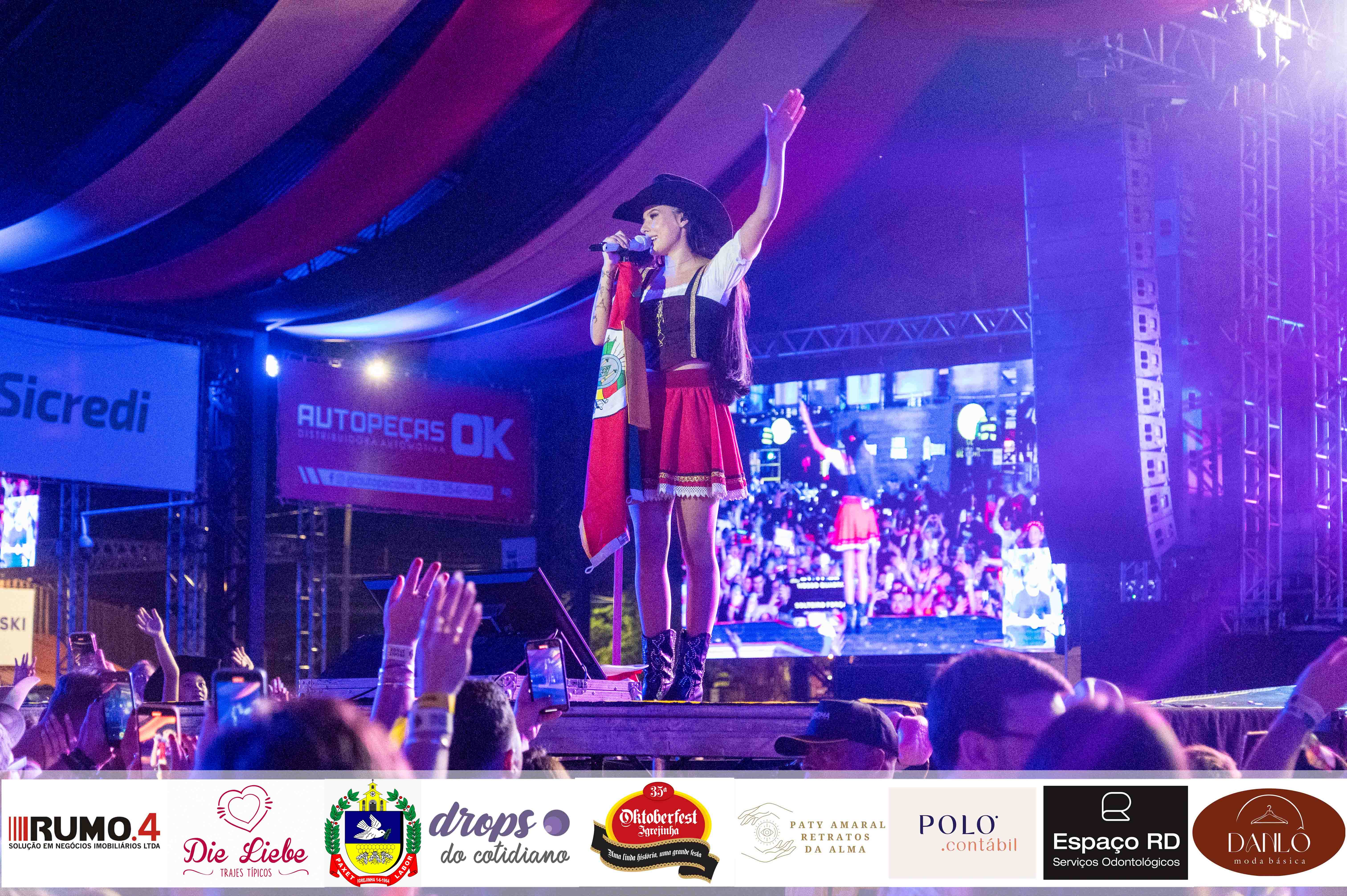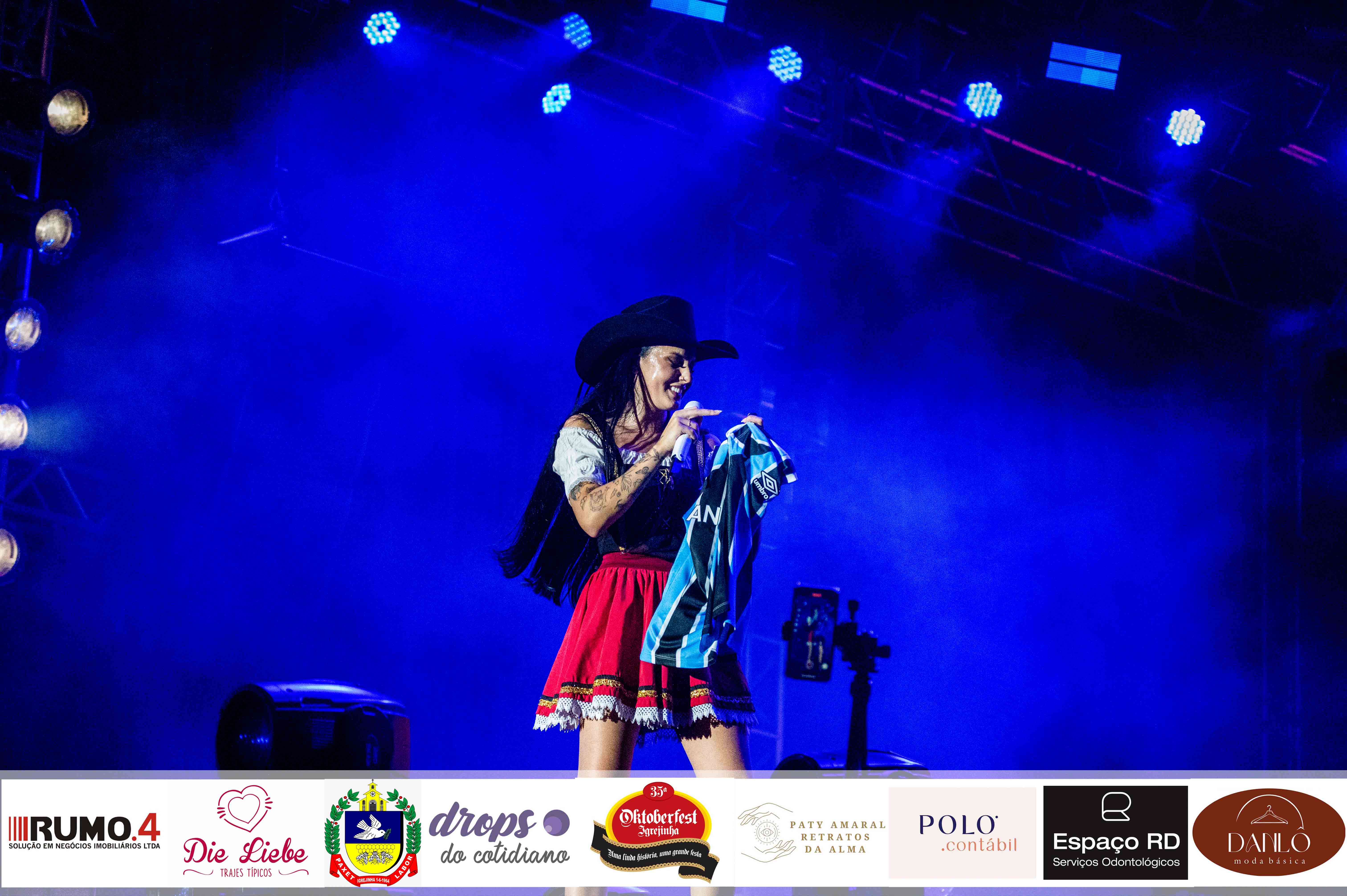 Fenômeno do sertanejo, a cantora Ana Castela subiu ao palco vestida com traje típico alemão para encerrar a 35ª Oktoberfest de Igrejinha na noite do domingo. Ela fez todo o público cantar com ela seus maiores sucessos, interagiu com o público, recebeu inúmeras cartinhas e esbanjou carisma. Dona do hit “Boiadera”, música que foi seu primeiro lançamento em 2021, Ana Castela embalou o pavilhão 2 com canções como “Nosso Quadro”, “Fronteira” e “Dona de Mim”.