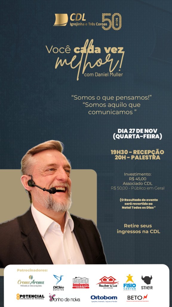 2024 foi um ano cheio de desafios, algumas dúvidas e a necessidade de reajustar e reinventar. Para fechar o ano e já começar a planejar e pensar 2025 com a energia lá em cima, a Câmara de Dirigentes Lojistas de Igrejinha e Três Coroas preparou um grande evento. No dia 27 de novembro (quarta-feira), Daniel Müller realizará a palestra “Você Cada Vez Melhor“. Será no Centro de Cultura de Três Coroas, a partir das 19h30. Especialista em vendas, palestrante e mentor consagrado, ele chega para, além das dicas de vendas, abordar um momento de positividade e inspiração para o público.