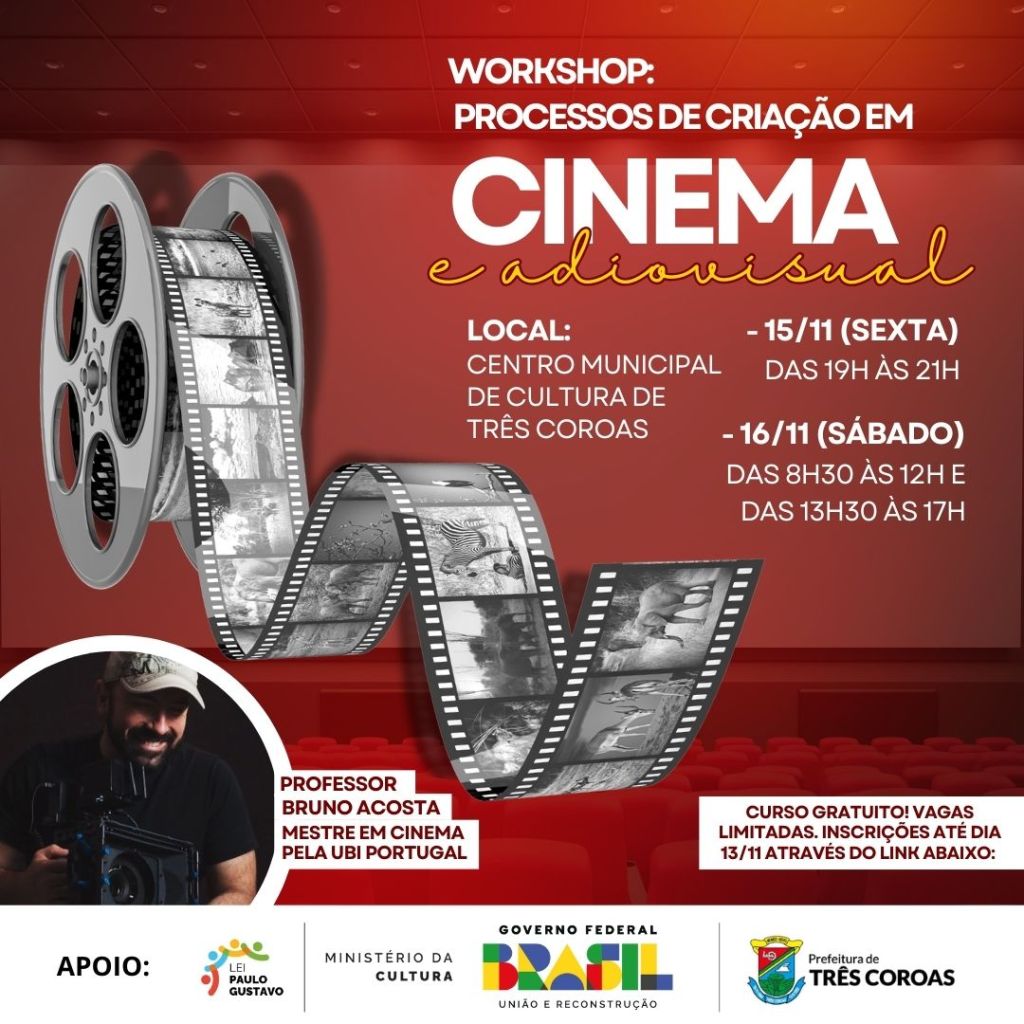 A comunidade de Três Coroas terá uma oportunidade de se desenvolver na área de produção audiovisual e de cinema. Estão abertas as inscrições para o workshop Processos de criação em cinema e audiovisual. Será nos dias 15 e 16 de novembro (sexta-feira e sábado), no Centro de Cultura, com o professor Bruno Acosta que é mestre em cinema. O curso é gratuito, financiado com recursos da Lei Paulo Gustavo, sendo uma oportunidade única para quem quer aprender mais sobre os processos de criação em cinema e audiovisual. As vagas são limitadas e as inscrições devem ser feitas através do preenchimento deste formulário.