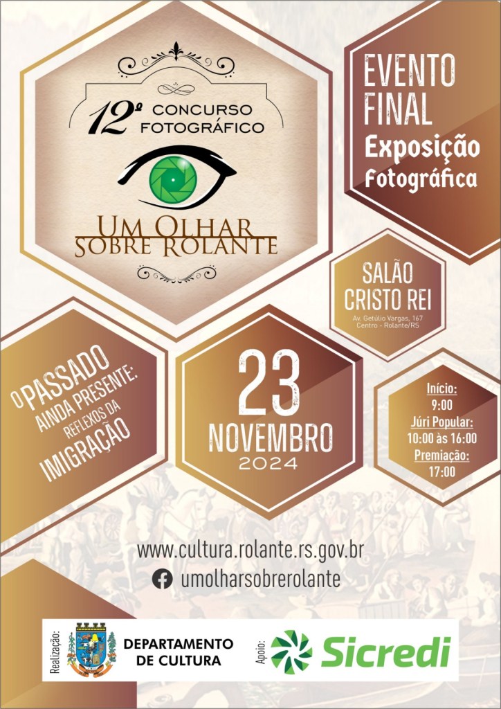A exposição do 12º Concurso Fotográfico Um Olhar Sobre Rolante será realizada no próximo sábado (23), no Salão Cristo Rei, a partir das 9h. A temática desse ano é “O Passado ainda Presente: Reflexos da Imigração“, propondo uma comemoração ao Bicentenário da Colonização Alemã e, em 2025, o Sesquicentenário da Colonização Italiana. O objetivo é registrar através da fotografia as diversas contribuições destas e de outras etnias para a cultura e o desenvolvimento da cidade, podendo serem registradas as manifestações culturais, patrimônio cultural material e imaterial, os prédios históricos, as sociedades de canto, as cooperativas, a gastronomia, entre outras. “O concurso busca estimular, através do olhar fotográfico, um olhar diferente, carinhoso e inusitado sobre as coisas do cotidiano. Um olhar que valorize nossa terra, nossas raízes, nossa cultura, nossa gente, nossa arquitetura, nosso patrimônio. E através deste novo olhar, criar um senso de orgulho e autoestima na cidade, fortalecendo e divulgando as potencialidades turísticas de nossa região e o senso preservacionista em relação ao patrimônio natural, cultural e histórico de Rolante”, declara diretora do departamento de cultura de Rolante, Joyce Reis.