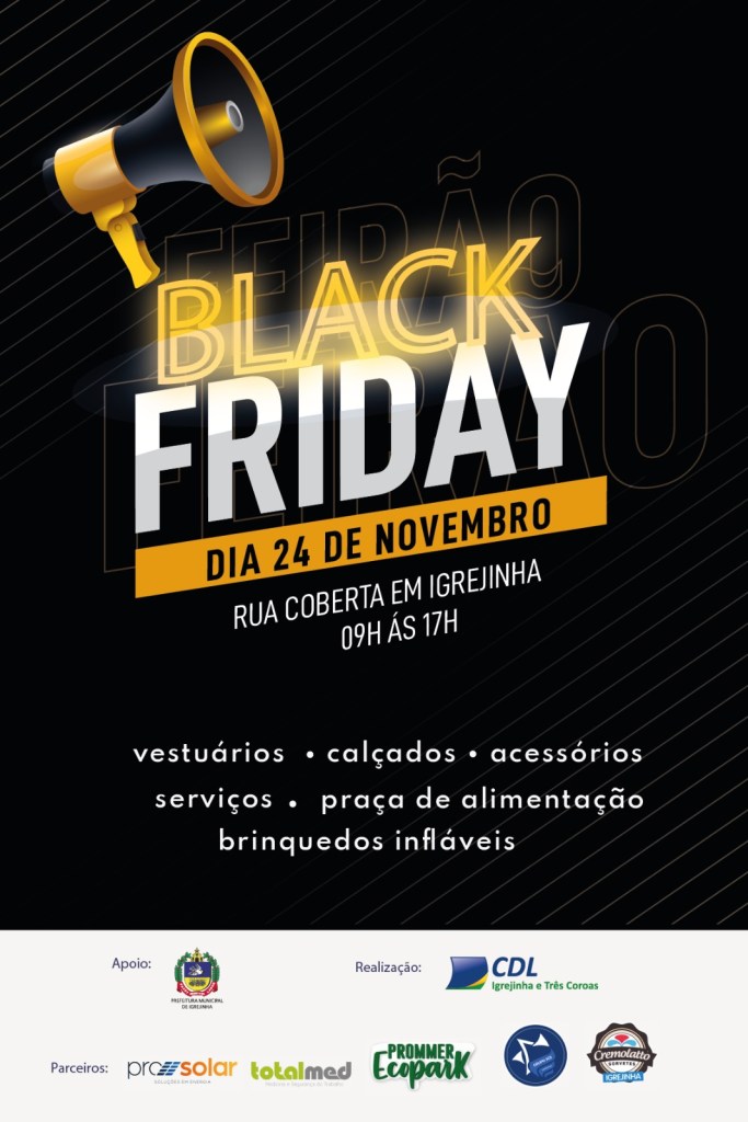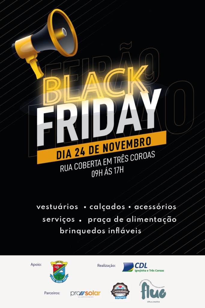 A Black Friday não poderia passar em branco na CDL de Igrejinha e Três Coroas. Por isso, o tradicional evento de descontos promovido pela entidade chega na versão Feirão Black Friday. Será no domingo (24), das 09 às 17 horas, simultaneamente nos dois municípios. Em Três Coroas, será na Rua Coberta, junto à Praça Affonso Saul. Já em Igrejinha, será na Rua Coberta ao lado da Praça Dona Luiza.