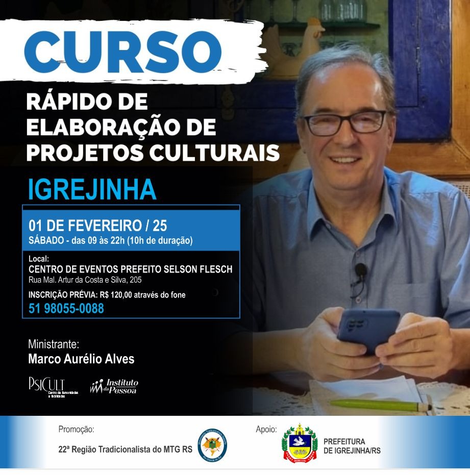 Os artistas e profissionais da área da cultura e indústria criativa terão, no próximo sábado (1º de fevereiro), uma oportunidade de aprendizado para aproveitar melhor a captação de recursos em editais. O curso rápido de Elaboração de Projetos Culturais será em formato de intensivo, com 10 horas de duração no mesmo dia, acontecerá no Centro de Eventos Prefeito Selson Flesch, em Igrejinha. Ele será ministrado pelo agente cultural e especialista em projetos culturais Marco Aurélio Alves.