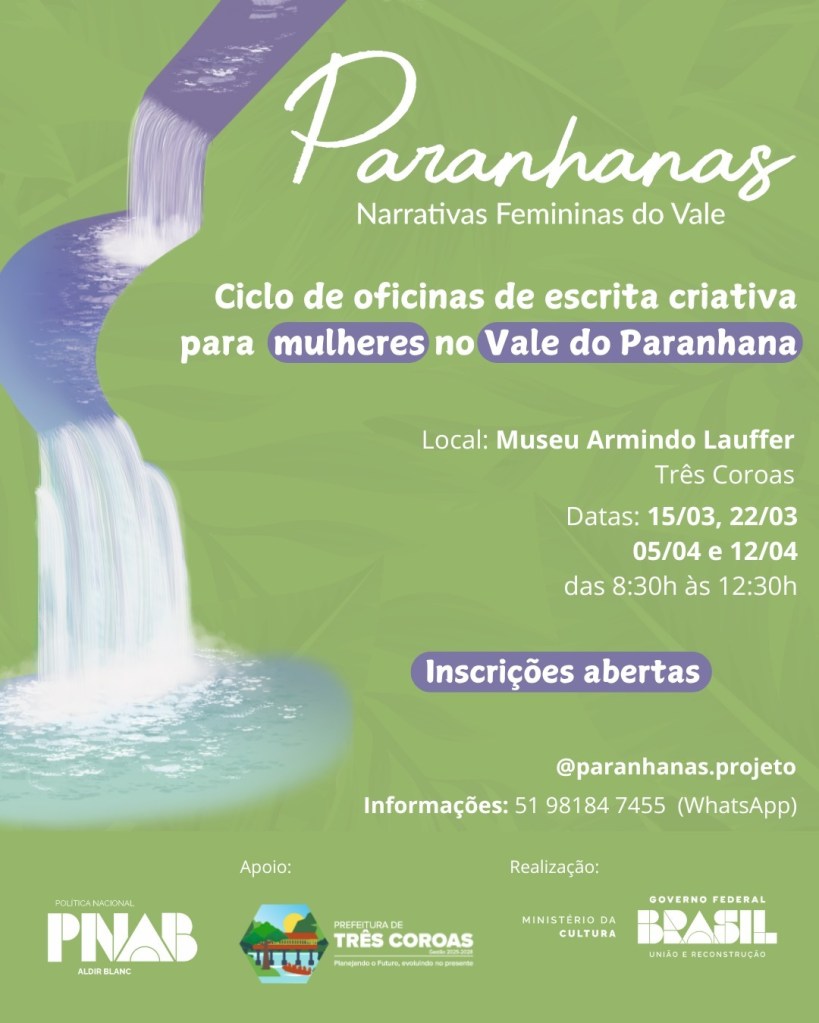 “O ciclo de oficinas de Escrita Criativa para mulheres – Paranhanas – Narrativas femininas do Vale é uma iniciativa que nasce das nossas profundezas, assim como as águas dos rios que vêm lá do fundo da terra e perfuram rochas para se transbordarem, vertendo vida e fazendo reverdejar o campo, fertilizando nossas existências. É uma iniciativa que busca a cocriação de um espaço acolhedor para que as mulheres do Vale do Paranhana possam narrar suas vivências. Encontros onde possamos encorajar umas às outras a contar nossas memórias, narrar nossas existências ou mesmo imaginar outros mundos possíveis. Através da conversa em roda, de exercícios de criatividade, observação, leituras e momentos de descontração, iremos juntas, exercitar o músculo da escrita”, destacam as oficineiras. Serão quatro manhãs (15/03, 22/03, 05/04 e 12/04, das 8h30 às 12h30) dedicadas à produção textual que irão dar origem a um livro do projeto ‘’Paranhanas’’, o qual abrigará e levará as narrativas para viajar por outros vales, inspirando mentes e tocando corações por onde passar.
