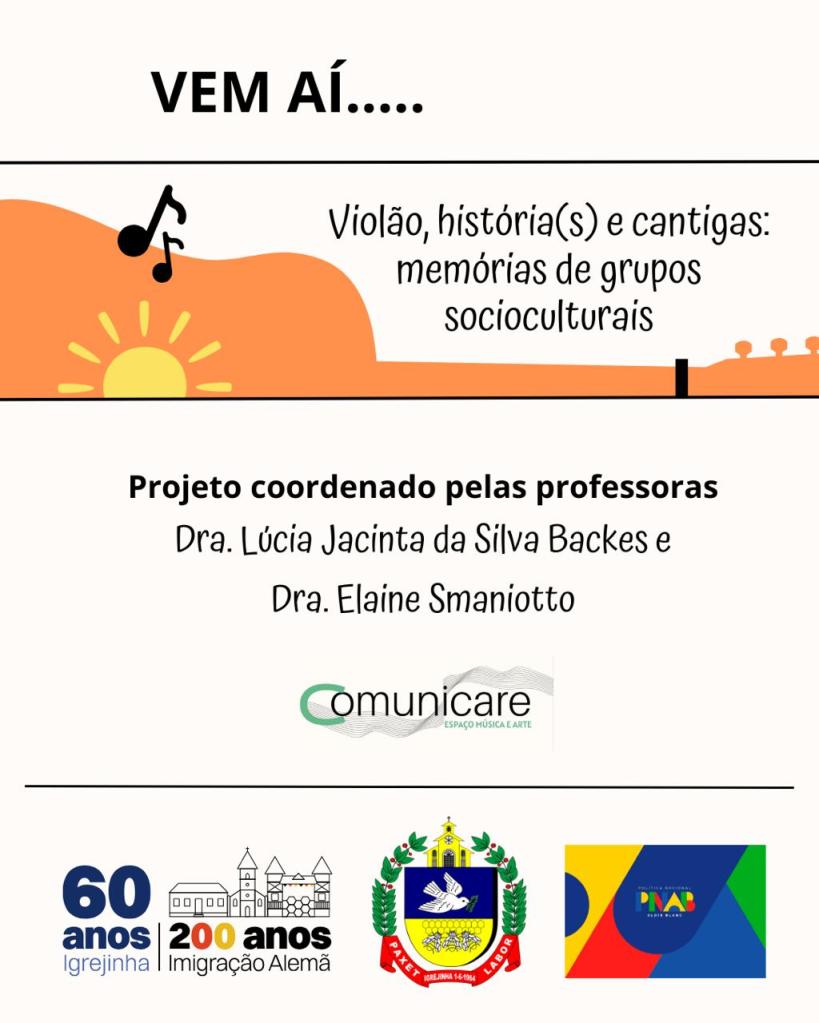 Serão 30 encontros presenciais, com emissão de certificado. “Será realizada a aprendizagem de violão com cantigas de roda, seus contextos socioculturais e musicalização – prática de ritmos, jogos musicais, elementos de notação musical (leitura e escrita da música) e cantos”, conta a coordenadora do projeto e professora de música Lúcia Jacinta da Silva Backes. Ela conta ainda que participante receberá um violão para as práticas do instrumento.