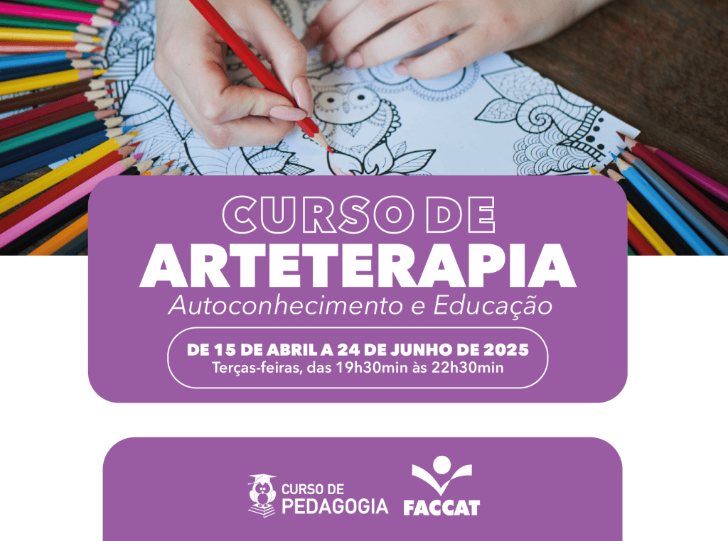 O curso Arteterapia, Autoconhecimento e Educação, com carga horária de 40 horas, será realizado às terças-feiras, das 19h30min às 22h30min, na Sala D406 do Estúdio de TV da Faccat, no campus. Durante 10 encontros, os participantes terão acesso a um conteúdo diversificado e enriquecedor, abordando técnicas terapêuticas que envolvem arte, meditação, expressões corporais e o uso de arquétipos, além de promover uma experiência prática de integração entre teoria e prática terapêutica. O conteúdo programático inclui: