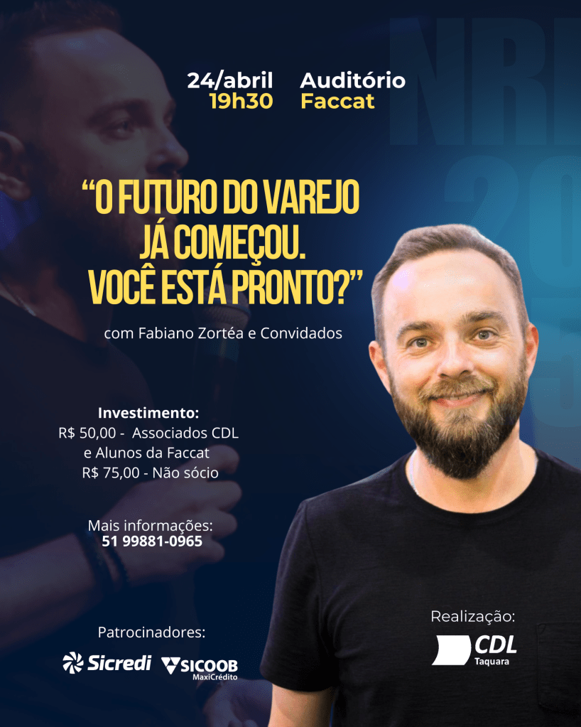 O principal evento do mundo quando o assunto é varejo é a NRF Retail’s Big Show, realizada anualmente em janeiro, em Nova Iorque. Sabendo disso, a CDL de Taquara promove o evento “O futuro do Varejo, já começou. Você está pronto?” para apresentar as principais percepções e ações a serem realizadas pelo setor. Será no próximo dia 24 de abril (quinta-feira), às 19h30, no Centro de Eventos da Faccat. Em pauta, estarão as tendências globais, as estratégias práticas para aplicar nos negócios locais e a oportunidade de networking.