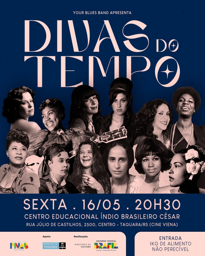 mundo. Essa é a experiência que poderá ser vivida na próxima sexta-feira (16), às 20h30, no Centro Educacional Indio Brasileiro Cezar, em Taquara. O espetáculo “Divas do Tempo (Vozes e Presenças Femininas na MPB, Blues e Jazz)” celebra as mulheres cantoras, com um repertório inteiramente dedicado a vozes femininas, e presta tributo a grandes artistas como Nina Simone, Ella Fitzgerald, Gal Costa, Elis Regina e Maria Bethânia. A entrada é solidária, mediante doação de 1kg de alimento não perecível.