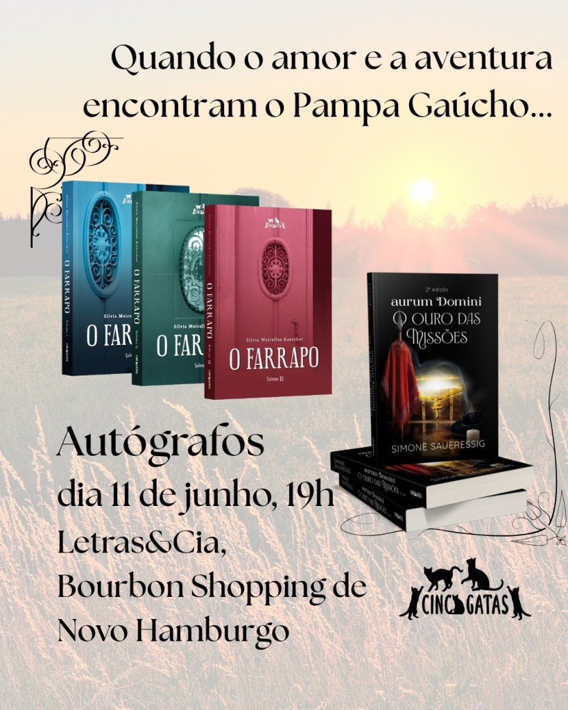 O livro “aurum Domini – O ouro das Missões”, escrito por Simone Saueressig, ganhou uma 2ª edição comemorativa de seus 15 anos de publicação, pela editora Cinco Gatas. A mesma editora está lançando o terceiro volume da trilogia “O Farrapo”, sucesso da autora Sílvia Meirelles Kaercher.