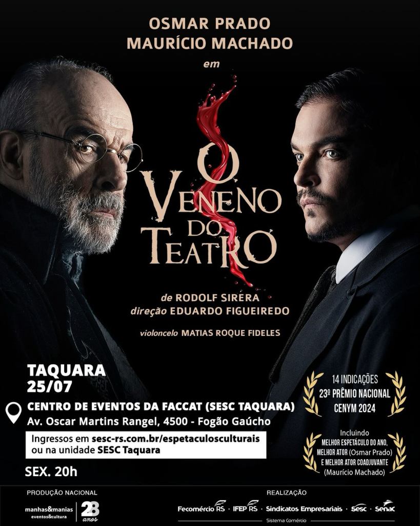 O renomado ator Osmar Prado trará o seu talento para a região na sexta-feira (25), em apresentação promovida pelo Sesc Taquara no Centro de Eventos Faccat. Ao lado de Maurício Machado, ele estrela o espetáculo “O Veneno do Teatro”, obra que se passa na Paris de 1920 e traz um excêntrico Marquês que contrata um ator para interpretar peça teatral de sua autoria. A trama provocadora se desenvolve em um jogo psicológico, onde um passa a controlar o outro, em um experimento que confunde os limites entre a realidade e a ficção.