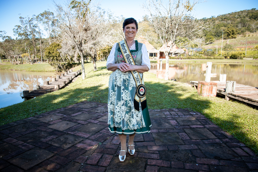 A Seniorin Vera Regina Flesch, representante da terceira idade da corte, apresentou um traje desenvolvido por Sonia Kaefer, da Sonia Moden Haus. “O traje foi inspirado na nossa ligação à cultura e ao folclore da tradição alemã. Juntamente com a esposa do presidente, Alana Jost, foi pensado para compor e ornar com os trajes da edição deste ano”, relatou Sonia. Ela ainda explicou que o traje se baseia na alegria Oktoberfest de Igrejinha e nos coloridos jardins da cidade, revelando bordados florais, rendas delicadas, pérolas e pedrarias.