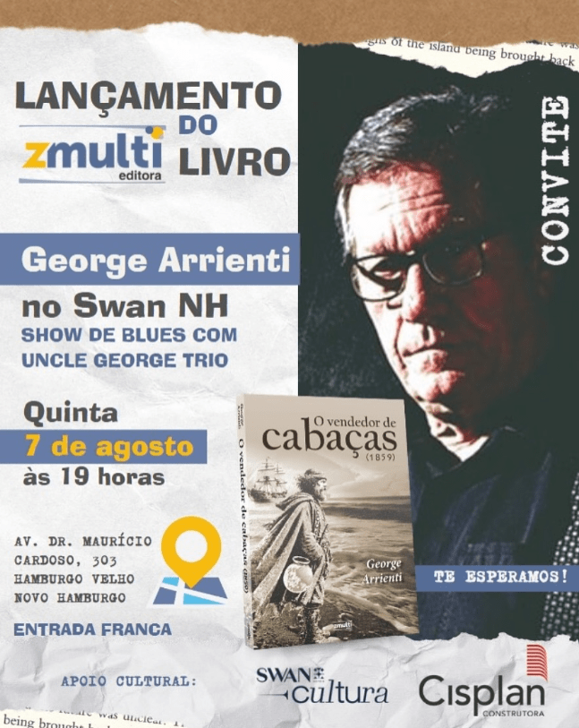 O arquiteto, músico e agora escritor George Arrienti prepara uma atividade cultural dupla. Na próxima quinta-feira (07), a partir das 19 horas, no Piano Bar do Swan Novo Hamburgo, ele fará um pocket show de blues do Uncle George Trio, com músicas autorais, e sessão de autógrafos do seu primeiro romance, o “O Vendedor de Cabaças (1859)”. O evento é gratuito e aberto ao público.