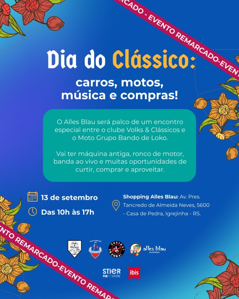 Os apaixonados por carros e motos antigas tem destino certo neste sábado (13), o Alles Blau Shopping a Céu Aberto. O espaço que já está antecipando a primavera, repleto de azaleias floridas, está preparado para o Dia do Clássico. Além da exposição de carros e motos antigas, haverá feira de artesanato, atrações musicais, além de sorteio de brindes e muita diversão.
