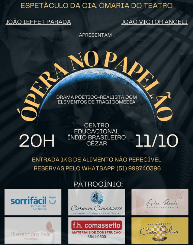 Vai ter teatro em Taquara em outubro! A Ópera no Papelão, um drama poético-realista com tons de tragicomédia, vai ser apresentada pela Cia. ÓMaria do Teatro, no dia 11 de outubro (sábado), às 20 horas, no Centro Educacional Índio Brasileiro Cézar. Com entrada solidária, o ingresso é 1Kg de alimento, mas os lugares devem ser reservados antecipadamente pois são limitados.