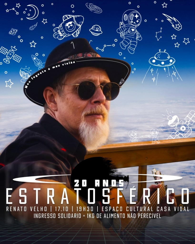 Os 20 anos do lançamento do marcante álbum “Estratosférico“, de Renata Velho, merecem uma comemoração memorável. Por isso, o artista prepara, para a próxima sexta-feira (17), com início às 19h30, um show intimista no auditório do Espaço Cultural Casa Vidal. Renato Velho irá cantar e contar as histórias desse álbum que foi gravado com a participação de grandes nomes do rock gaúcho e lhe rendeu o Prêmio Açorianos de Melhor Instrumentista 2005. O ingresso é solidário: 1kg de alimento.
