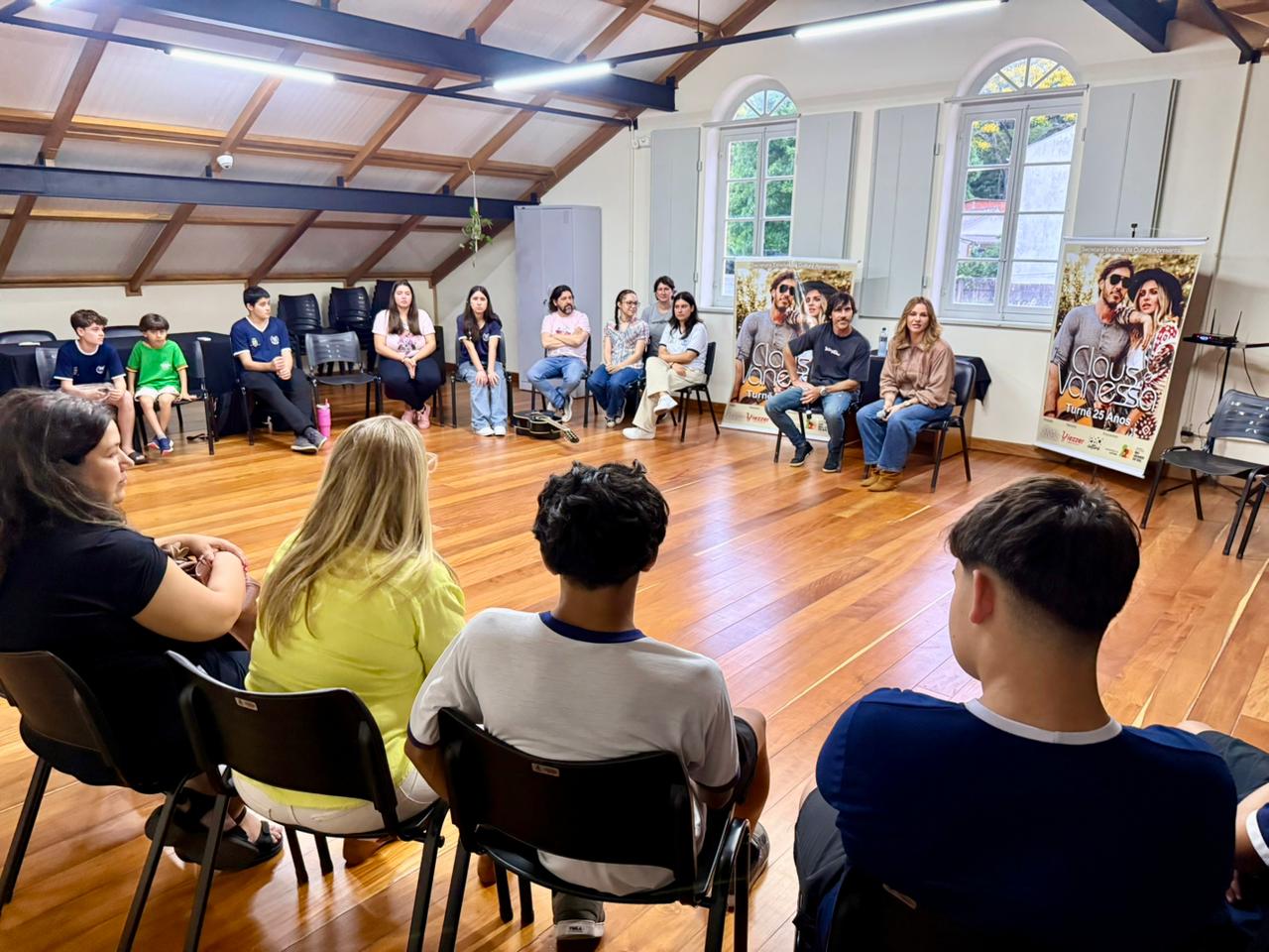 Antes do show, Claus & Vanessa realizaram uma oficina musical com alunos da aula de musicalização da Escola Cívico-Militar (ECIM), no Espaço Cultural Casa Vidal. A atividade contou com a participação do maestro Alex Barbosa e proporcionou aos estudantes um momento de aprendizado e troca com os artistas.