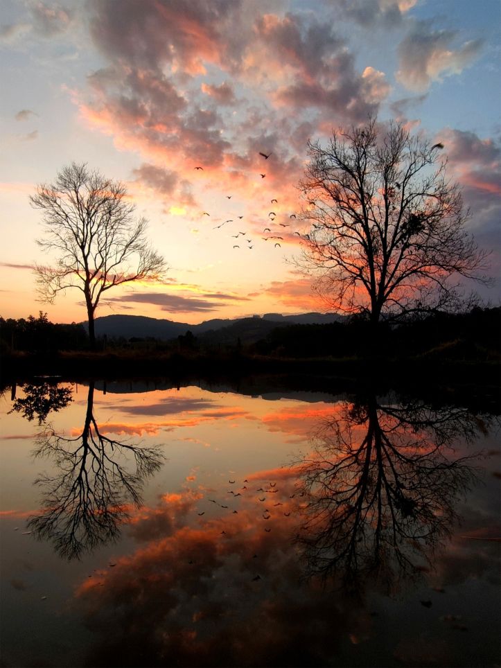 Relação da foto ao tema do concurso: Duas nogueiras refletidas no espelho de um lago tranquilo continuam firmes mesmo sem suas folhas, resilientes esperando a próxima estação. São fortes como o povo rolantense que já enfrentou grandes catástrofes da natureza, mas segue se reerguendo porque tem raízes firmadas na fé, no trabalho e na esperança de um futuro cada vez melhor.
