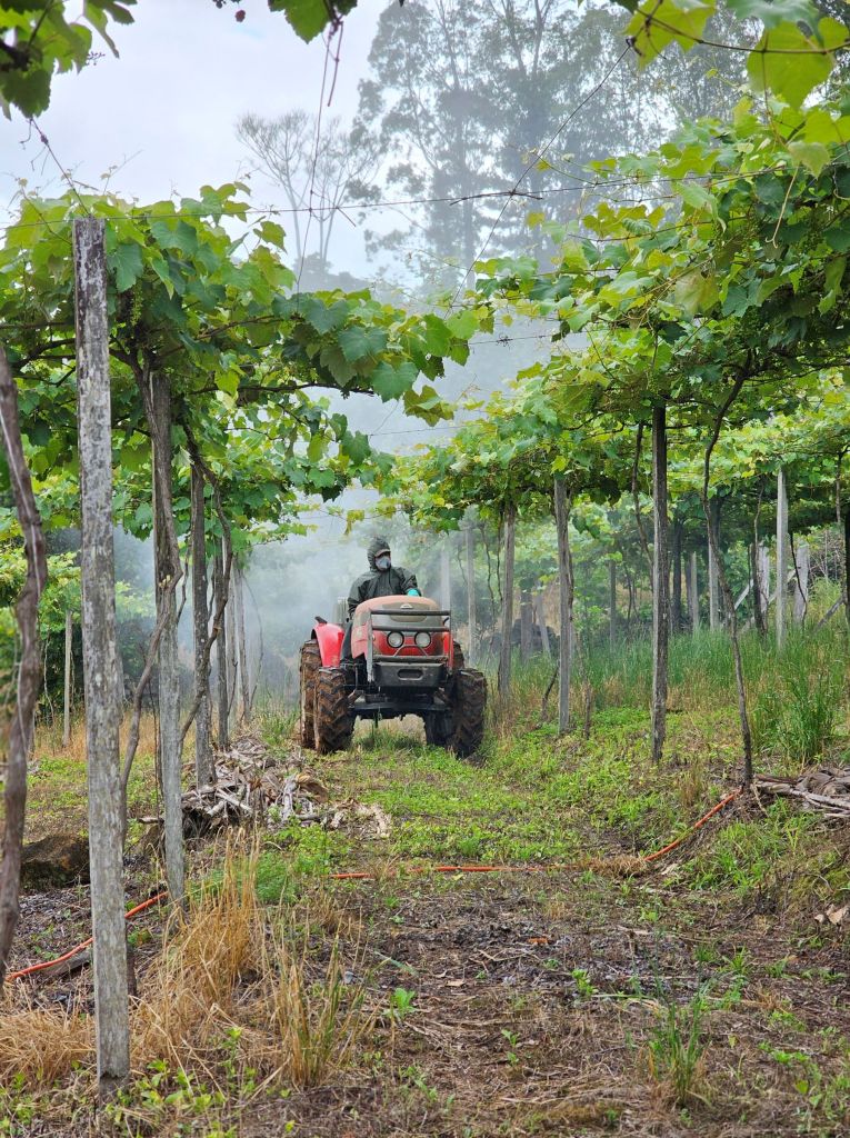 Relação da foto ao tema do concurso: O cuidado, com amor e devoção, às videiras que exibem seus lindos cachos de uvas, ao fruto que é transformado, por nossas mãos, em deliciosos produtos oferecidos aos turistas no Caminho das Pipas. Nosso orgulho e fonte de sustento.